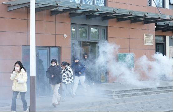 伴着应急广播系统的疏散指令,8号楼内720余名住宿女生在疏散引导组的指引下,用湿毛巾捂住口鼻,弯腰低姿沿疏散楼梯快速有序撤离,安全抵达新餐厅对面篮球场集结点,整个疏散过程规范、高效,充分展现了我校师生良好的应急素养。