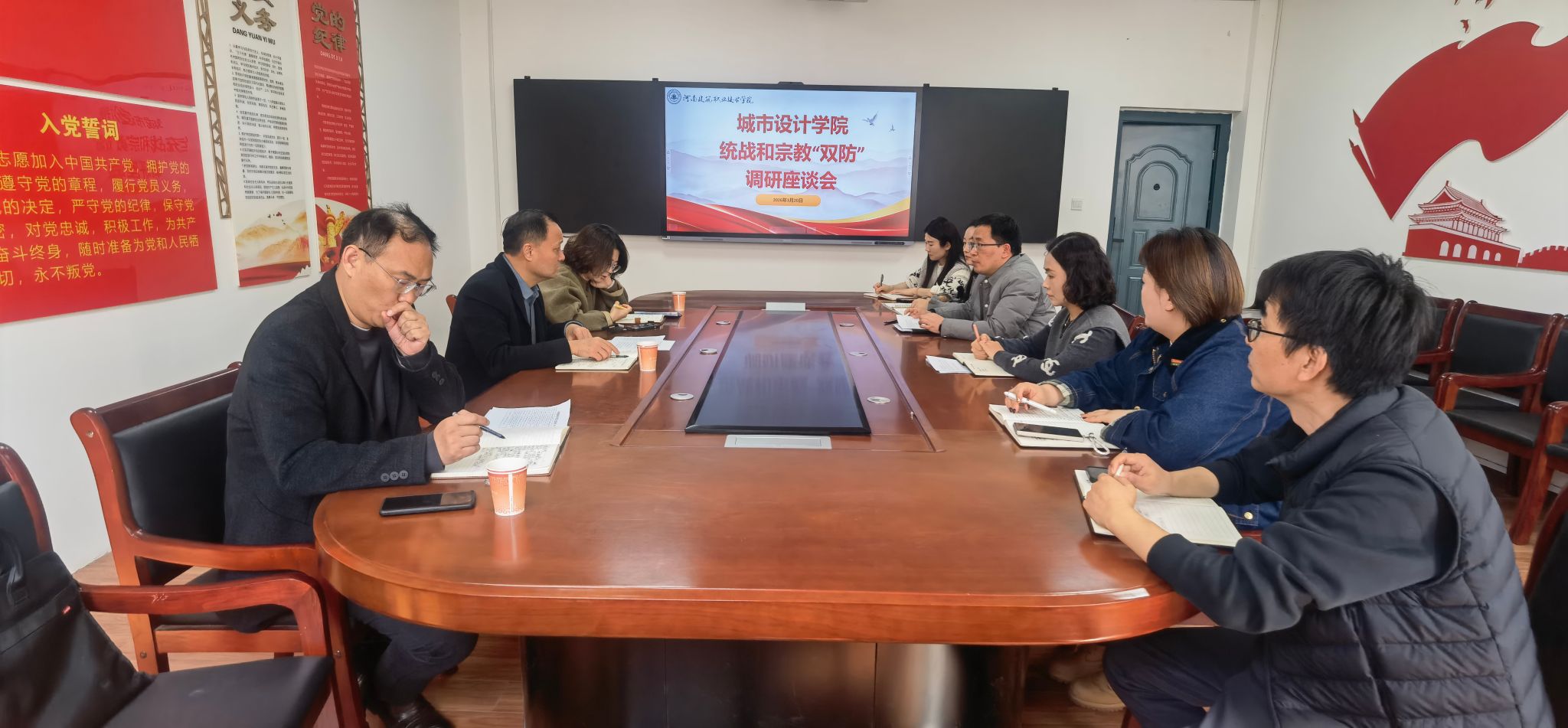 为深入落实中央和省委关于统一战线及宗教工作的决策部署,推动统战工作与宗教“双防”工作走深走实,3月20日下午,学校党委统战部一行到城市设计学院开展专题调研座谈,学院党政领导班子全程参与。座谈会上,学院党总支副书记许法轩、副院长李燕结合工作实际,汇报了学院统战工作开展、“双防”工作落实及师生思想动态研判等情况,就党外知识分子思想引领、宗教渗透防范、重点学生帮扶等关键问题作了交流。