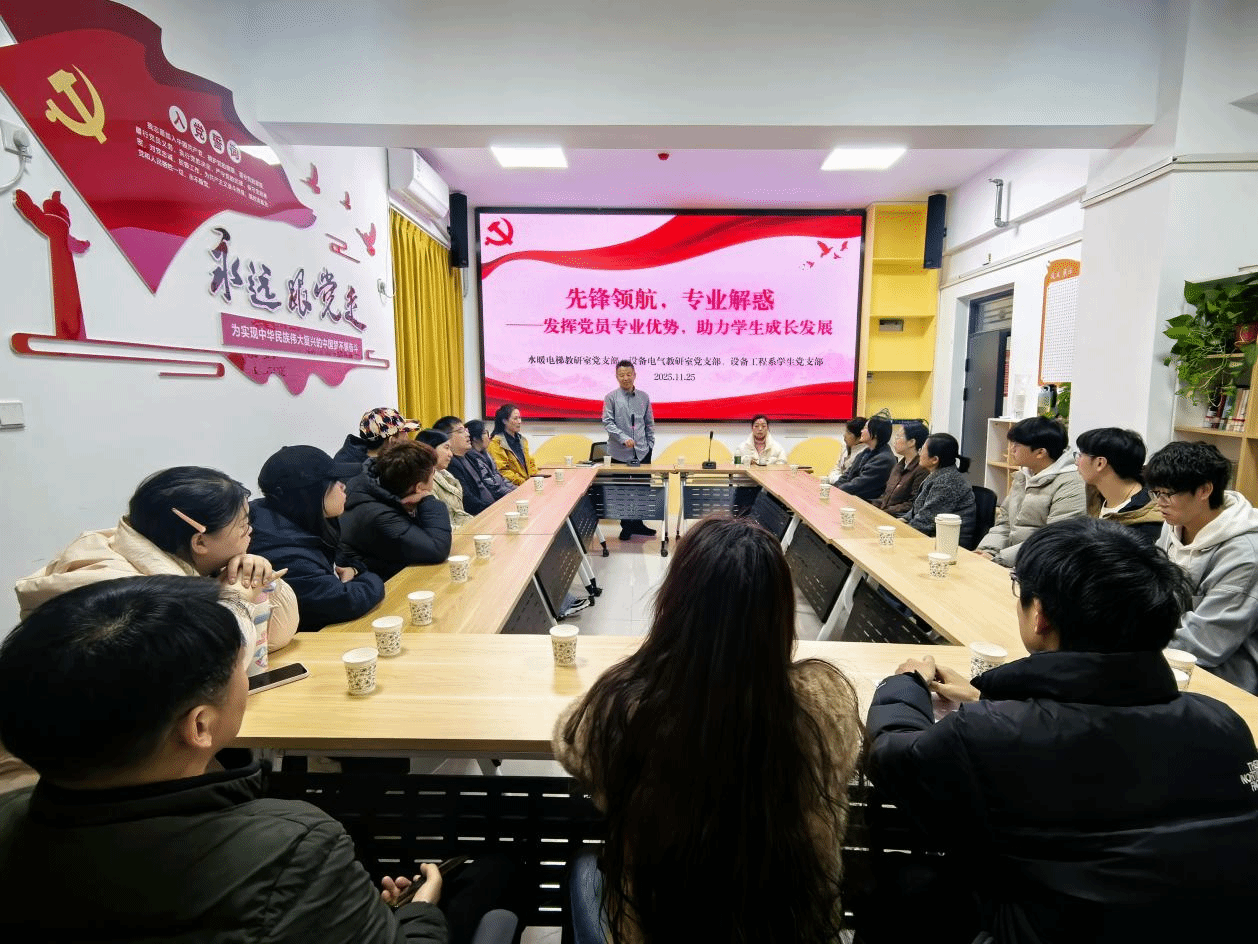 2025年11月25日,设备工程系学生党支部联合设备电气教研室党支部、水暖电梯教研室党支部,在兰馨苑“一站式”学生社区党团活动室共同开展“先锋领航,专业解惑”主题党日活动。活动聚焦解决学生专业学习实际问题,旨在强化党员教师责任意识与先锋模范作用,推动党建与业务深度融合,进一步提升支部凝聚力与育人实效。