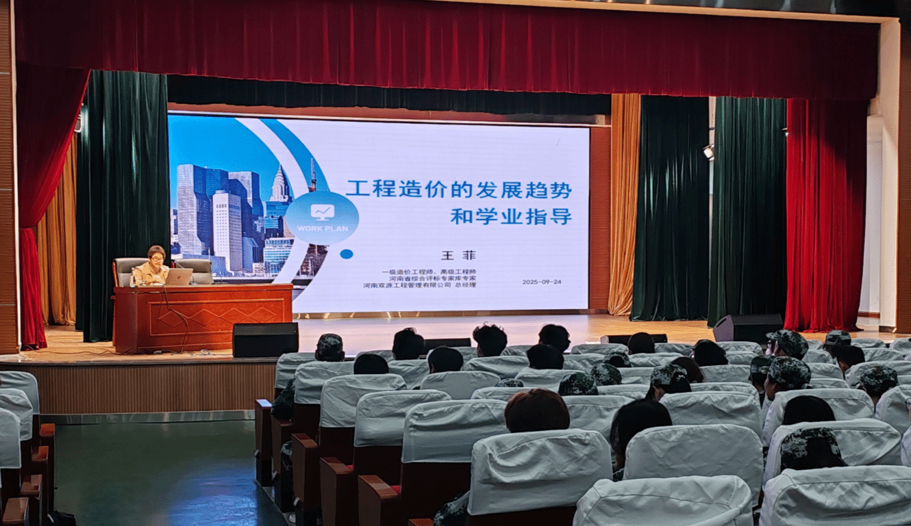 会上,河南双源工程管理有限公司总经理王菲受邀分享工程造价的发展趋势,并对2025级新生进行了专业指导。她从行业前沿视角切入,结合自身职业成长经历,深入解读工程造价专业内涵,同时分析企业对人才的需求标准与行业发展趋势,为参会学生提供了贴合实际的学业规划建议。