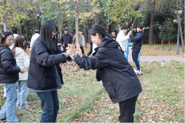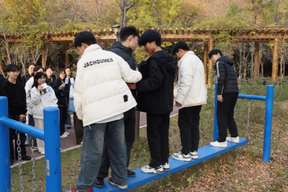 本次户外拓展活动,是“心理+”模式与系“一站式”社区服务力量的生动结合。活动现场设置了“不倒森林”“地面相依”“独木桥”及“独行月球”等一系列富有挑战与趣味的团队协作游戏。同学们在“不倒森林”中筑牢信任基石,在“地面相依”里学习支撑与平衡,跨越“独木桥”挑战自我极限,并在“独行月球”中体悟团队归属。各个环节不仅充满了欢声笑语,更引导同学们在实践与互动中反思自我、管理情绪、增进理解,将积极心理品质的培养寓教于乐。活动现场,同学们热情洋溢、全情投入、相互鼓励,在合作与挑战中增进了解,深化友谊,驱散了初冬的微寒。