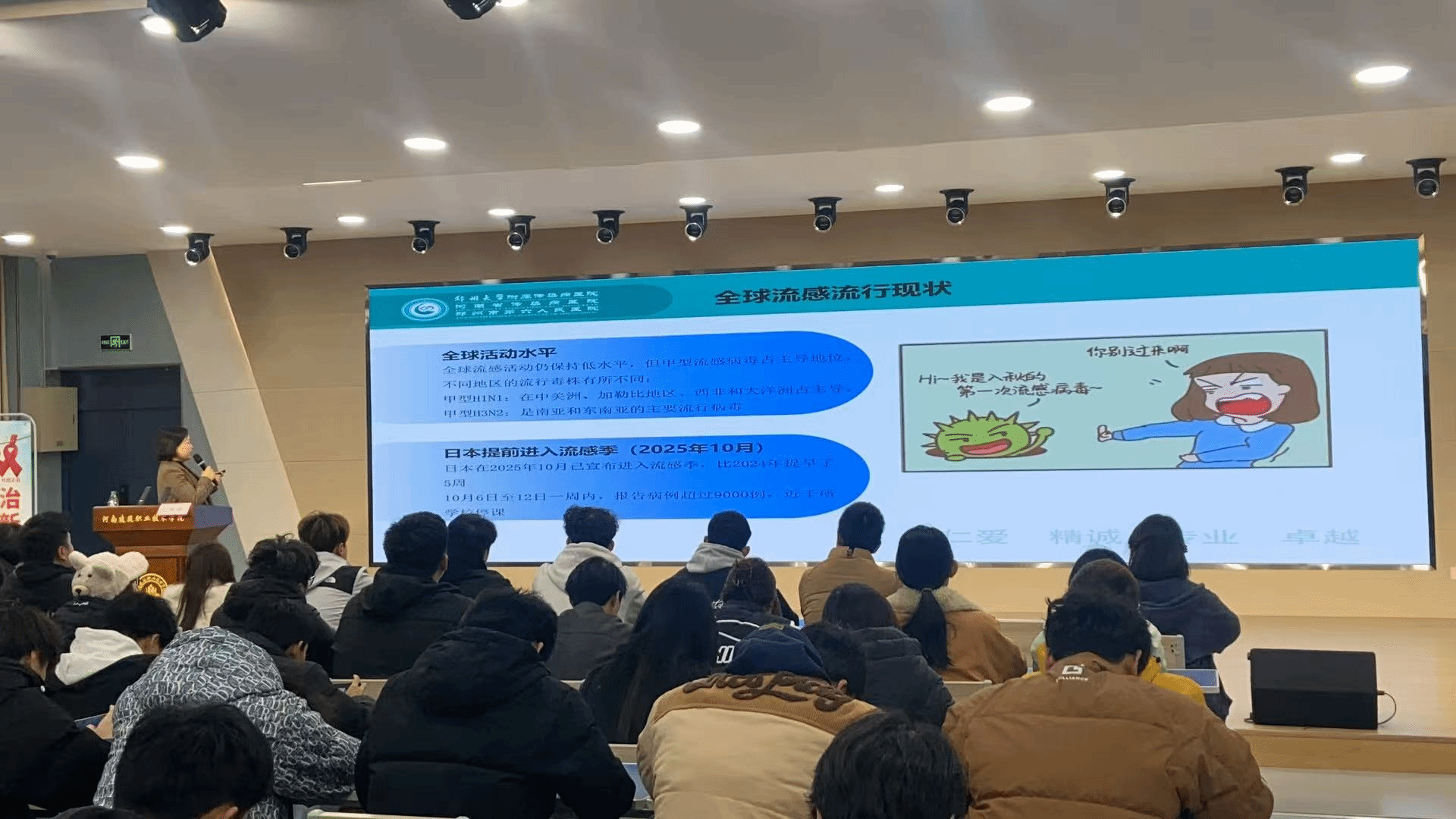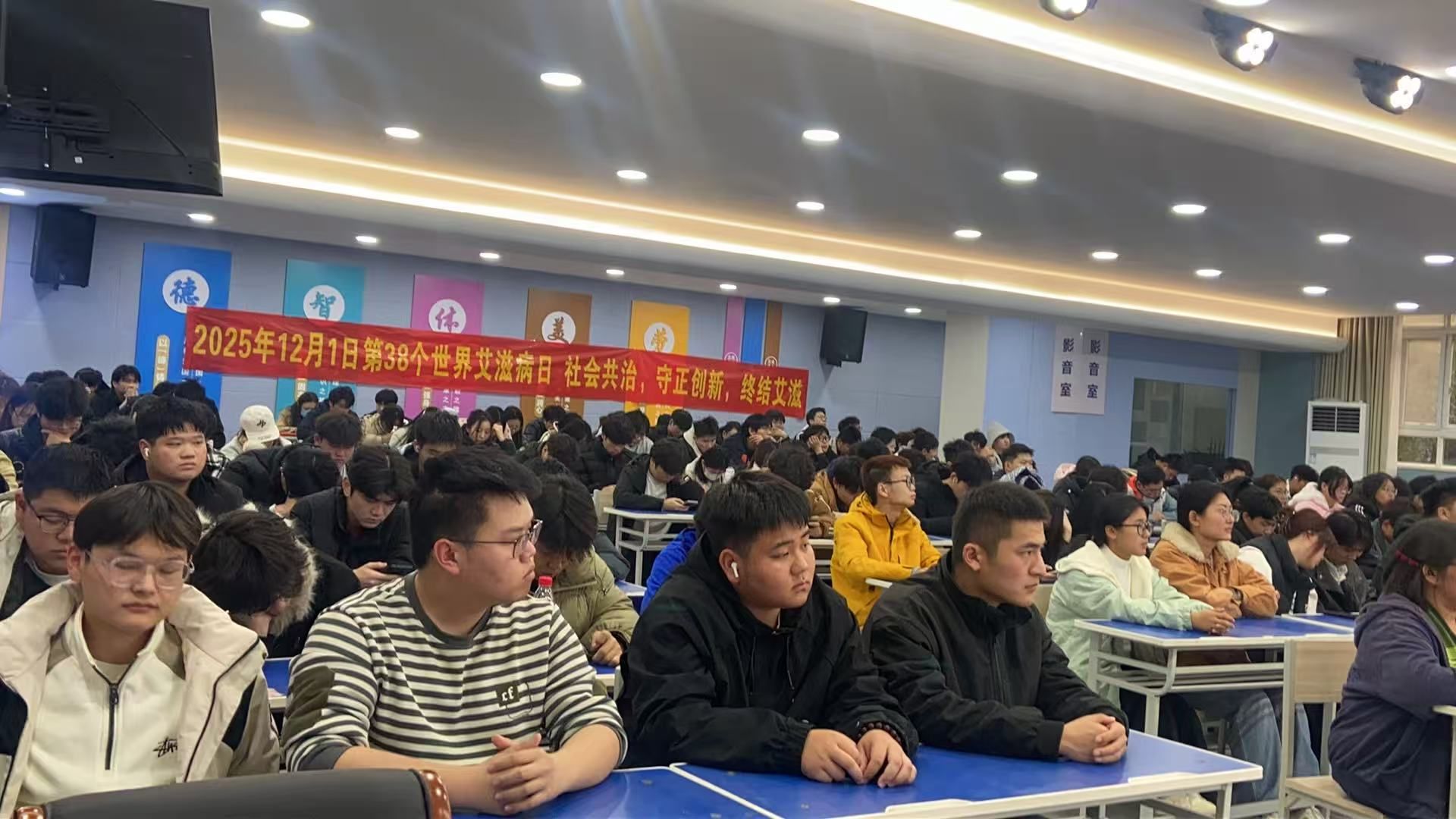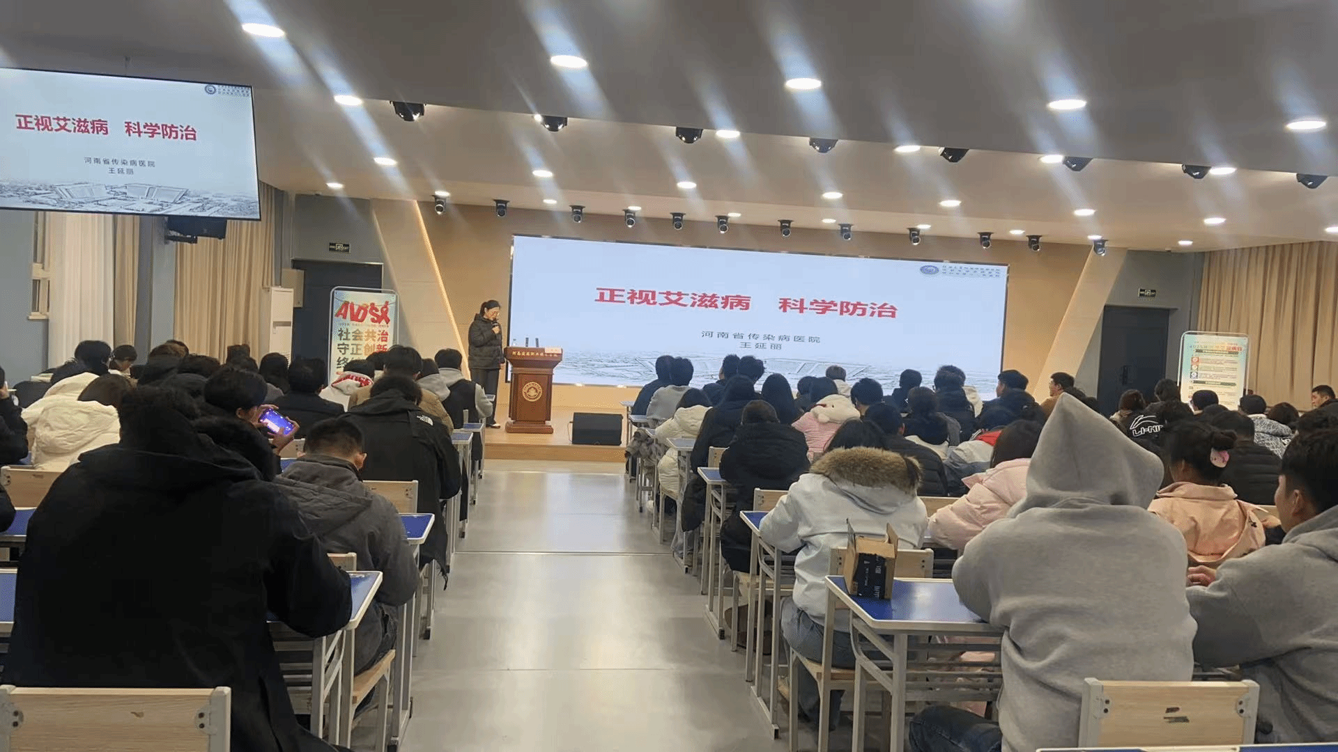 为迎接第38个“世界艾滋病日”,贯彻“社会共治,守正创新,终结艾滋”的宣传主题,同时精准应对当前流感高发态势,切实守护全校学生身心健康,11月20日下午,由学校后勤管理处精心组织的健康知识宣讲活动在校园顺利举行。活动特别邀请郑州市第六人民医院的医疗专家团队担任主讲,全校学生积极参与,现场氛围浓厚。