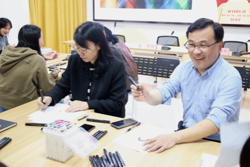 本次沙龙活动在“心语破冰”成语抢答游戏中拉开序幕,两组成员围绕“心”字成语展开激烈角逐,在轻松愉悦的氛围中感受语言背后的情绪力量,现场互动热烈,笑声不断。在“我眼中的你”绘画传递环节,每组成员在纸上画出自己画像的第一笔,随后依次传递,小组共同完成对每个成员的画像并认真写下心里话。当画像最终传递到本人手中时,大家纷纷分享、收获感动与惊喜,深刻体会到同事间真挚的情感支持与团队温暖。