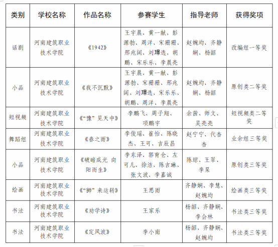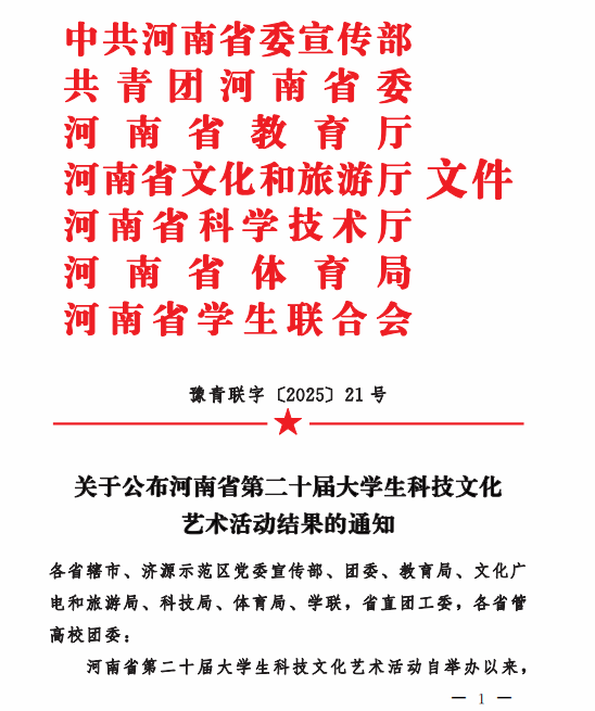 近日,由中共河南省委宣传部、共青团河南省委、河南省教育厅、河南省文化和旅游厅、河南省科学技术厅、河南省体育局、河南省学生联合会联合主办的河南省第二十届大学生科技文化艺术节各奖项结果揭晓。在本次比赛中,我校共荣获8个奖项,其中一等奖1项、二等奖2项,三等奖5项。