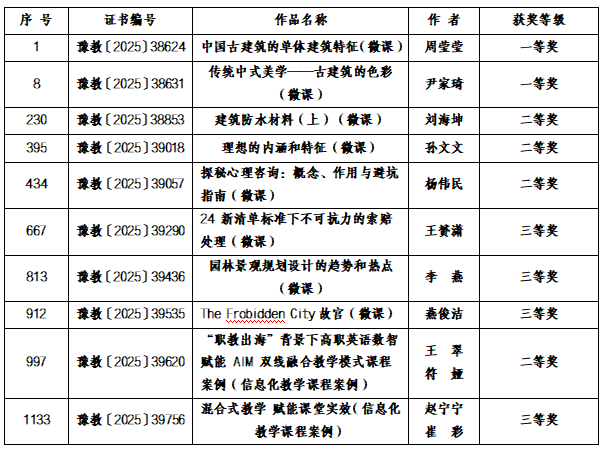 根据《河南省教育厅办公室关于举办河南省第二十九届教育教学信息化交流活动的通知》文件要求,由我校申报、专家评审,经省教育厅评比,现将河南省第二十九届教育教学信息化交流活动评选结果(详见下图)予以公示。