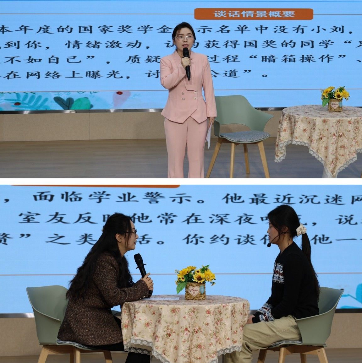 经前期基础知识测试、学情分析、案例研讨等环节的层层选拔,7名优秀辅导员脱颖而出进入本次谈心谈话大赛。比赛聚焦学生工作中的高频难点场景,设置了网络舆情引导、学业困难与心理危机叠加、“慢就业”与家庭期望冲突、校园贷危机处置等多个贴合实际的谈话主题。比赛中,7位选手面对预设的复杂情境,他们迅速进入角色,以尊重理解为前提,凭借敏锐的观察力精准捕捉学生核心诉求——或耐心倾听缓解情绪,或情理结合剖析问题,或立足实际给出方案,既展现了对政策规定的熟练掌握,又体现了人文关怀的温度。面对学生的抗拒沉默、情绪激动等模拟反应,选手们灵活调整沟通策略,用真诚的态度搭建信任桥梁,用专业的方法化解矛盾困惑,充分彰显了新时代辅导员的沟通协调能力、应急处置能力和育人引导能力,赢得了现场观众的阵阵掌声。最终宋芳、董梦佳荣获一等奖,鲁娅蕊、沙俊丽、姚清洋、周莹、战魏丽荣获二等奖,梁娅琼、冯巧英等7名选手荣获三等奖,土木工程系和工程管理系凭借出色的组织工作和参赛成绩斩获优秀组织奖。