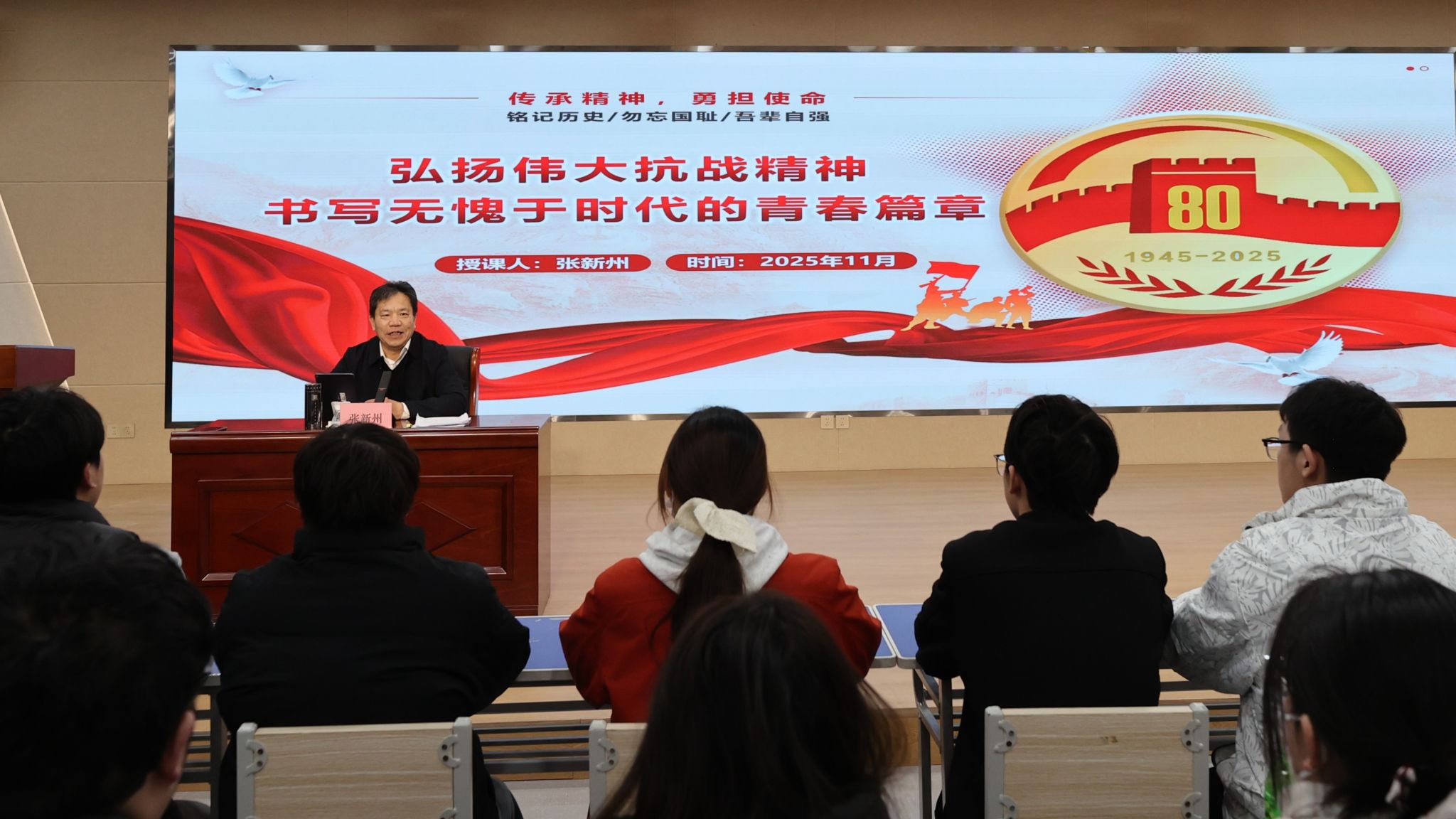张新州以弘扬伟大抗战精神为核心展开宣讲。他指出,从“九·一八”事变到“七七事变”,从平型关大捷到百团大战,从无数革命先烈抛头颅、洒热血的英雄事迹,到中国人民在极端艰难的条件下众志成城、顽强抗争的壮阔历程,抗日战争的胜利是中国人民用鲜血和生命换来的,伟大抗战精神蕴含着天下兴亡、匹夫有责的爱国情怀,视死如归、宁死不屈的民族气节,不畏强暴、血战到底的英雄气概,百折不挠、坚忍不拔的必胜信念,这些精神特质在当下依然具有重要的时代价值。他还结合当今时代复杂多变的国际形势和国内发展任务,在重温抗战历史、弘扬伟大抗战精神同时,帮助学生深刻理解伟大抗战精神的核心内涵,引导学生将抗战精神与新时代价值观相融合,树立正确的历史观、民族观、国家观,以更清醒的头脑和更广阔的视野认识世界。