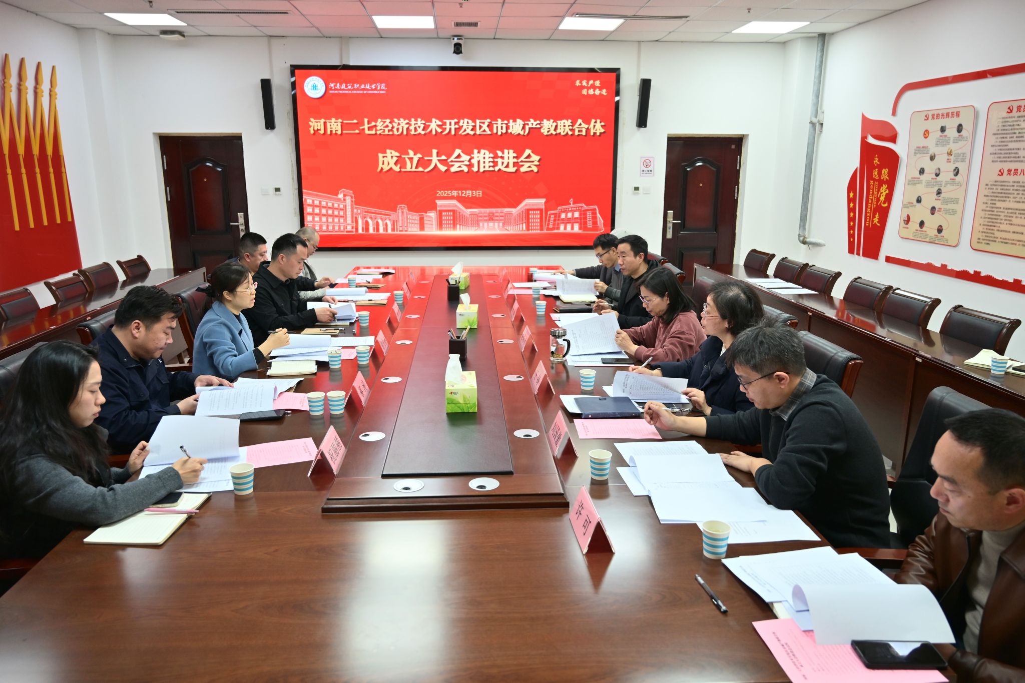 河南二七经济技术开发区市域产教联合体由河南二七经济技术开发区管理委员会、郑州新大方重工科技有限公司及我校联合牵头组建,拟于12月中下旬召开成立大会。本次推进会旨在商讨确认成立大会相关细节,确保大会顺利召开。
