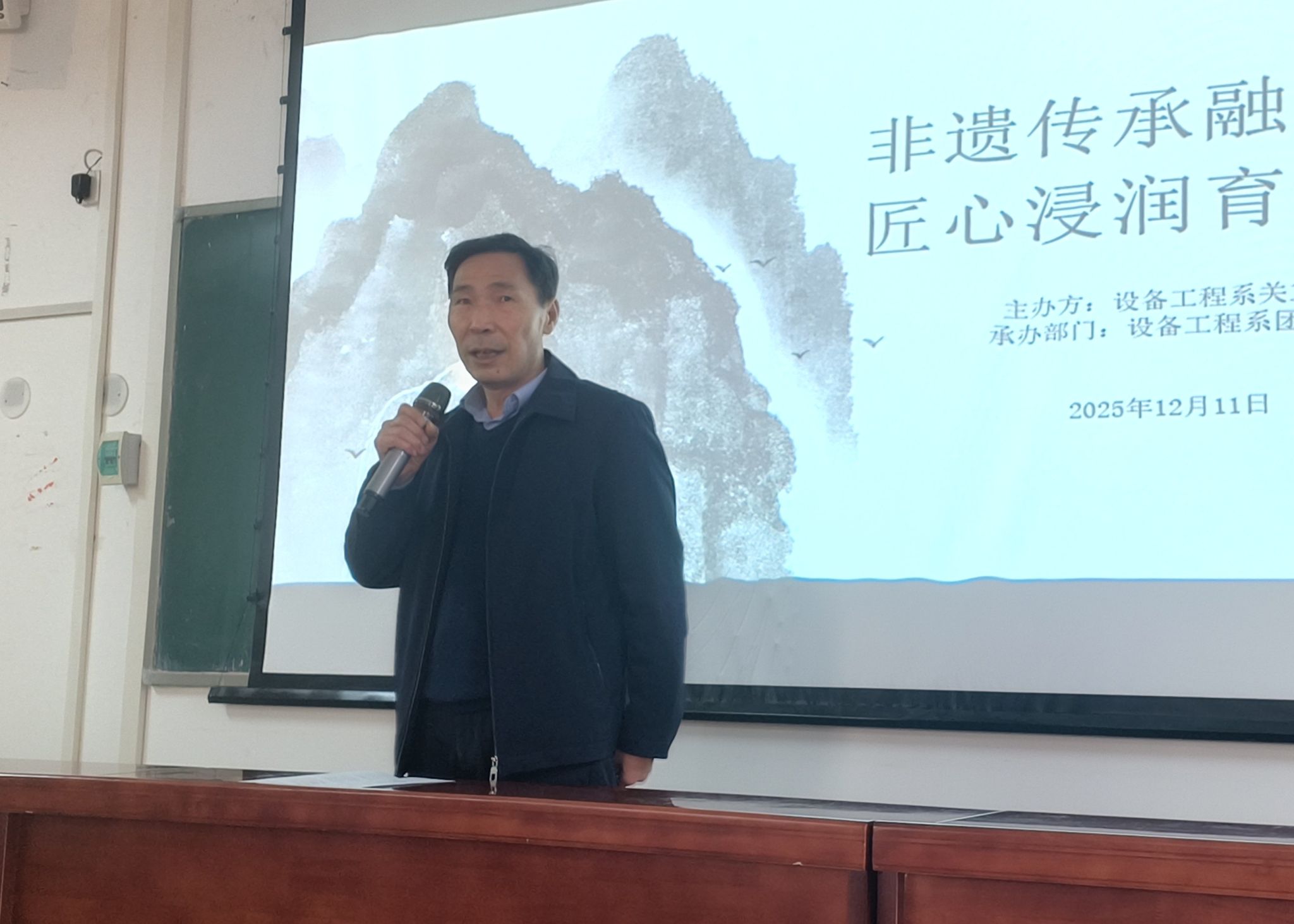 袁长林致辞,指出,非遗传承与思政教育的结合是培养时代新人的重要路径,中华优秀传统文化是思政教育的深厚沃土,非遗中蕴含的工匠精神、家国情怀与社会主义核心价值观高度契合。希望同学们,既要学好非遗技艺、增强文化自信,更要领悟匠心内核,将个人成长与国家发展、文化传承紧密联结。