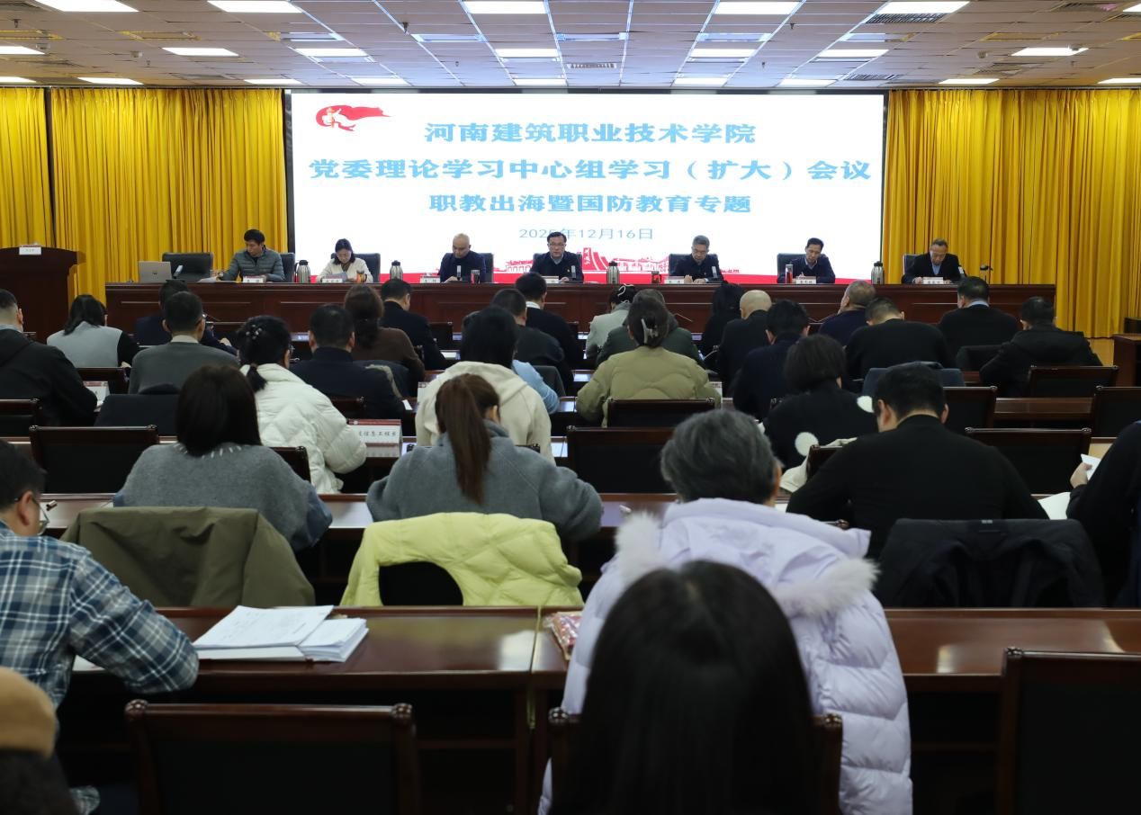 12月16日,我校召开党委理论学习中心组学习(扩大)会,开展“职教出海暨国防教育”专题学习及2025年出国(境)学习交流成果汇报。在校学校党委委员、校领导班子成员出席会议。会议由校党委书记梅杨主持。