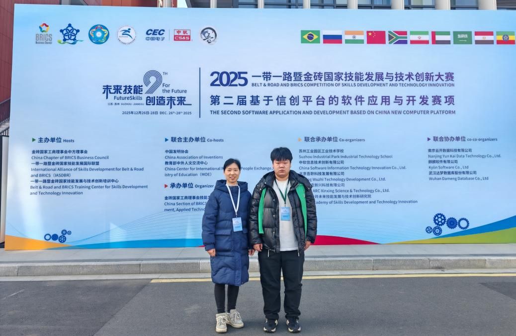12月26日至28日,由金砖国家工商理事会中方理事会、“一带一路”暨金砖国家技能发展国际联盟、“一带一路”暨金砖国家技能发展与技术创新培训中心主办,金砖国家工商理事会技能发展、应用技术与创新中方工作组,苏州工业园区工业技术学校等单位承办的2025“一带一路”暨金砖国家技能发展与技术创新大赛第二届基于信创平台的软件应用与开发赛项圆满落幕,本次大赛吸引了全国153支高职代表队参与角逐,竞争尤为激烈。我校建设信息工程系李艳老师,指导计算机应用技术专业学生王子阳,通过高强度刻苦训练,从众多参赛选手中脱颖而出,最终荣获国赛一等奖。