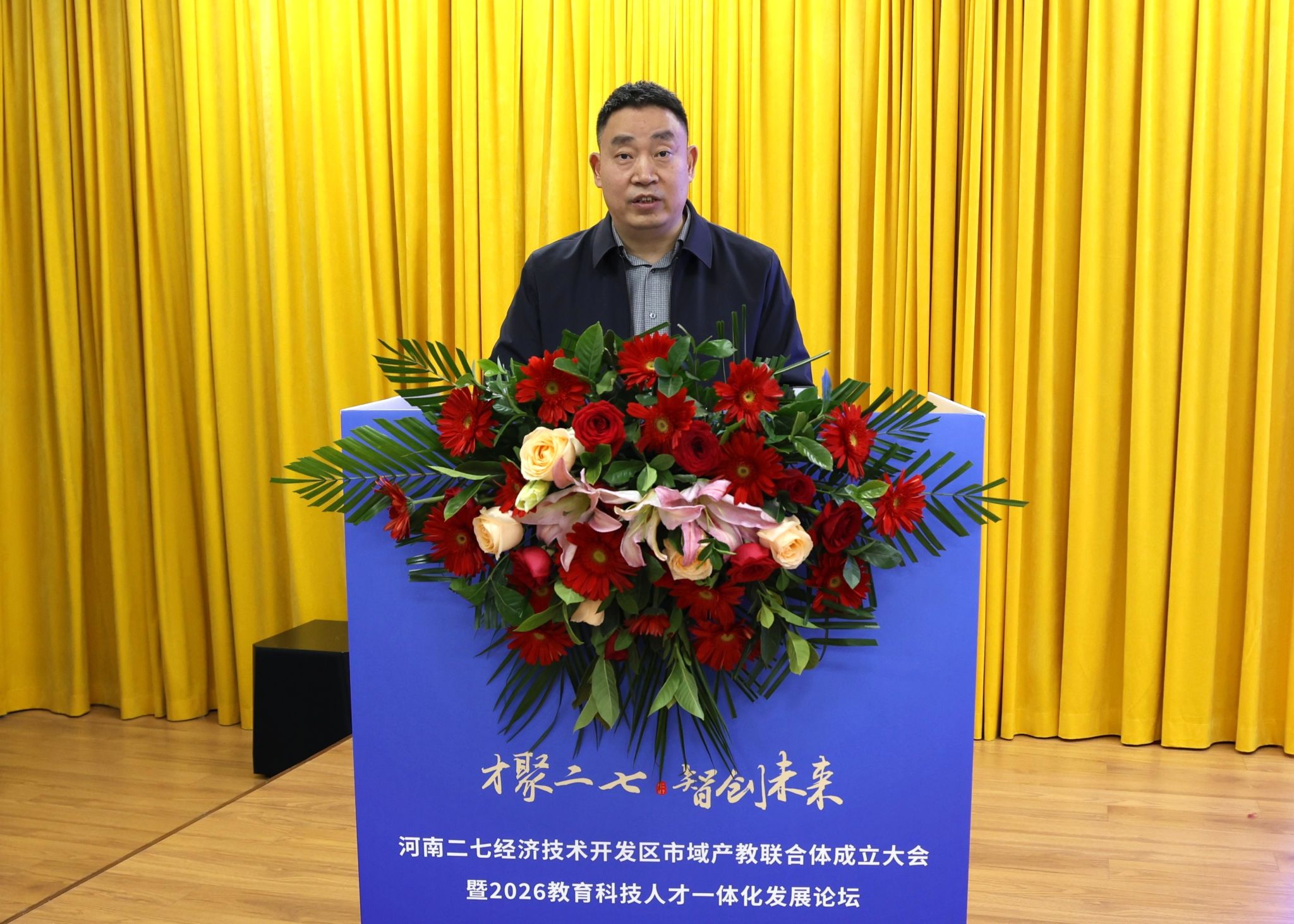 河南建筑职业技术学院党委书记梅杨代表学校对参会的领导和嘉宾表示热烈欢迎。他指出,党的二十届四中全会提出统筹教育、科技、人才强国建设,构建“政产学研用”融合创新联合体;省委十一届十次全会锚定科教强省目标,以“1+2+4+N”体系为牵引推进建设,为政行校企协同育人搭建了广阔平台。作为牵头单位,学校将以联合体成立为契机,立足办学积淀与专业优势,深度对接二七经开区产业布局,与成员单位同心聚力、同频共振,书写职业教育赋能区域经济高质量发展崭新篇章。