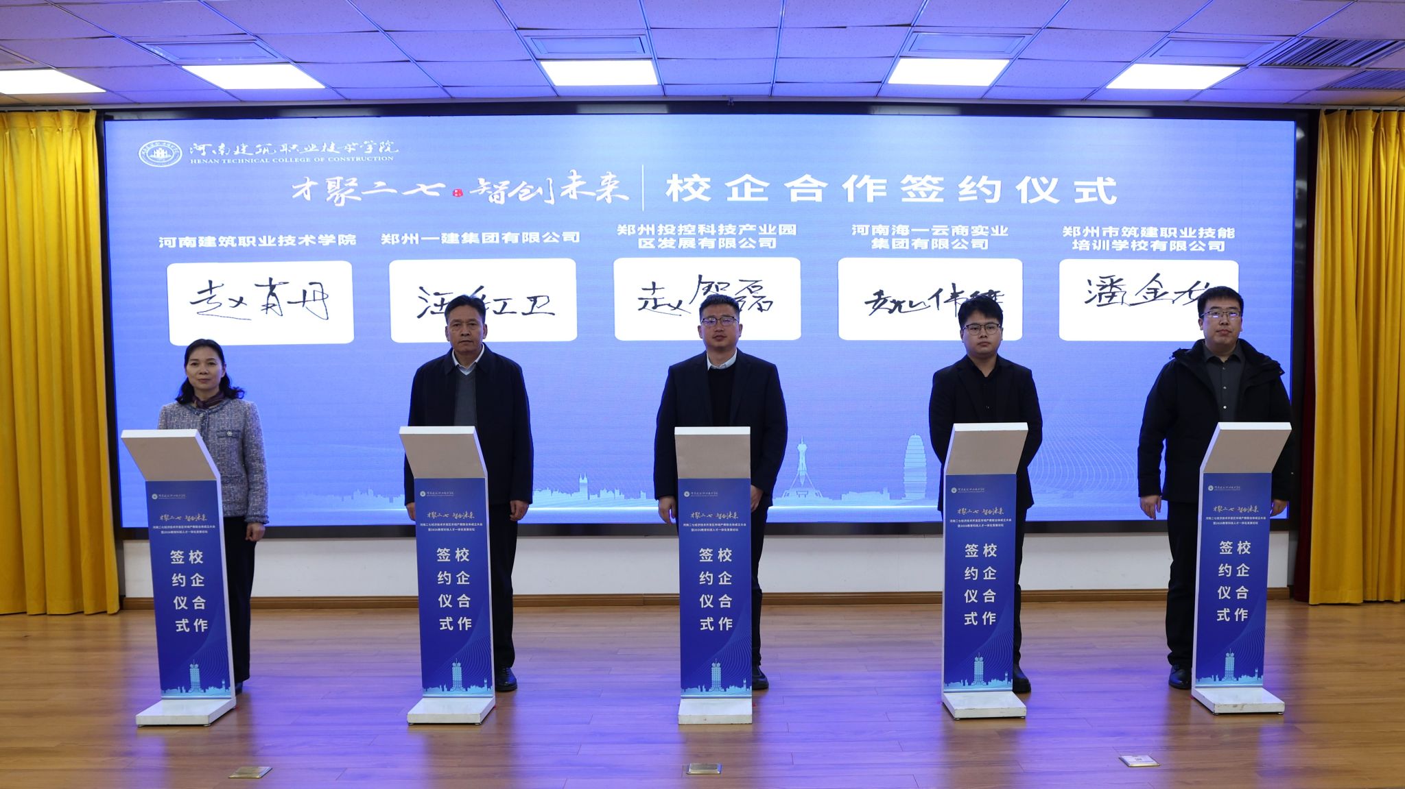 大会集体审议并表决通过了河南二七经济技术开发区市域产教联合体章程和组织机构名单。河南省教育厅领导、郑州市、二七区领导以及牵头单位领导分别为联合体理事长单位、常务副理事长单位、副理事长单位授牌。会上,副校长赵肖丹代表河南建筑职业技术学院与郑州一建集团有限公司、郑州投控科技产业园区发展有限公司、郑州市筑建职业技能培训学校有限公司举行了校企合作签约仪式。