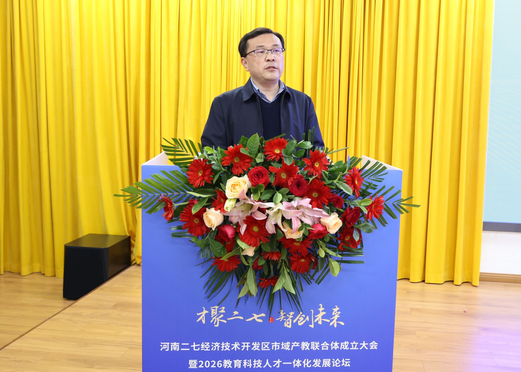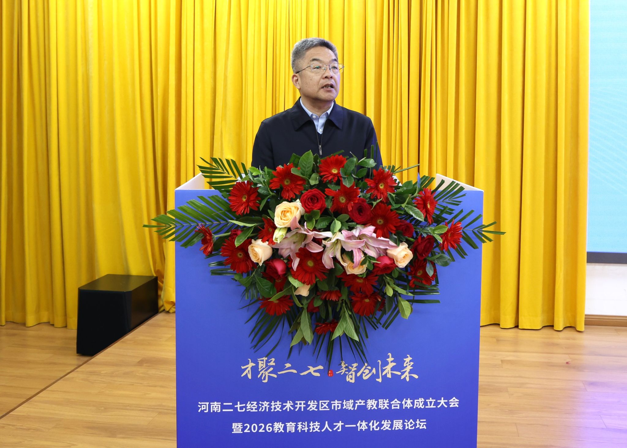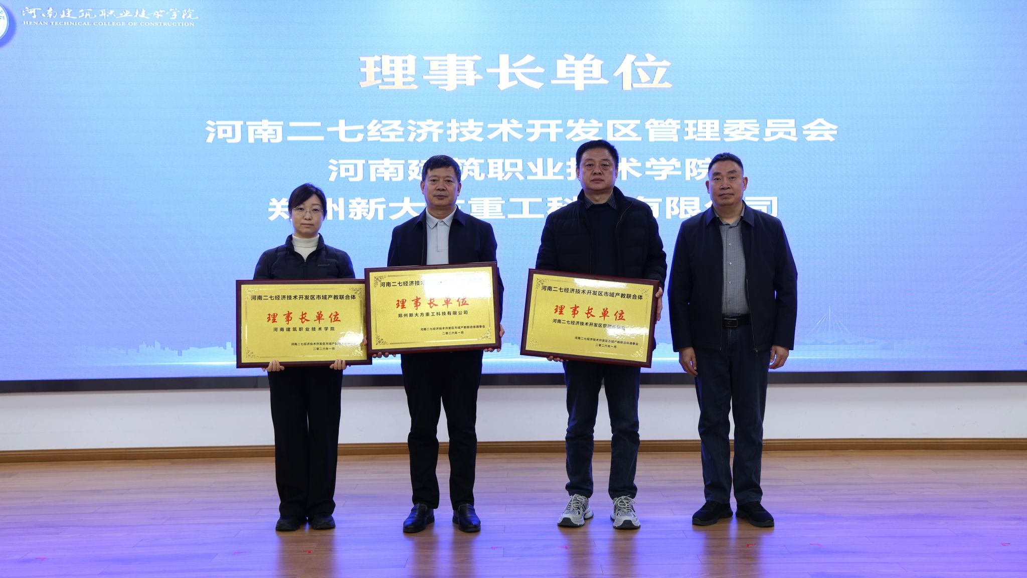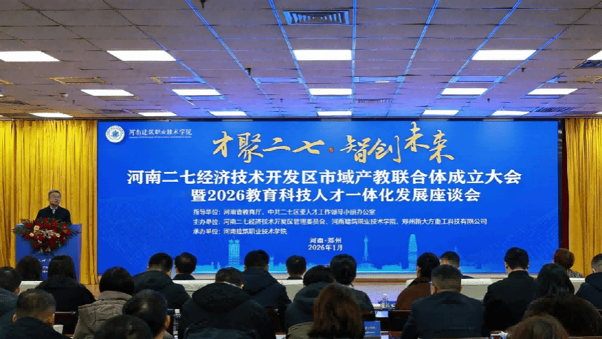 1月9日,在河南省教育厅和中共二七区委组织部人才工作领导小组办公室指导下,由二七经济技术开发区、河南建筑职业技术学院、郑州新大方重工科技有限公司牵头,联合郑州市二七区相关政府部门、企业、院校、科研机构、行业组织共同组建的河南二七经济技术开发区市域产教联合体,在我校召开“才聚二七 智创未来”——河南二七经济技术开发区市域产教联合体成立大会暨2026教育科技人才一体化发展座谈会。