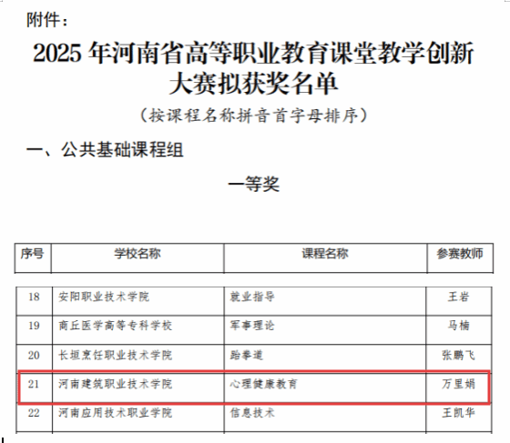 近日,河南省教育厅发布了《关于2025年河南省高等职业教育课堂教学创新大赛拟获奖名单的公示》,我校马克思主义学院教师万里娟凭借《大学生心理健康教育》课程的创新教学设计与精彩现场展示,从公共基础课程组众多参赛选手中脱颖而出,斩获一等奖,充分彰显了我校思政育人与心理健康教育深度融合的教学改革成效和教师队伍过硬的教学创新能力。