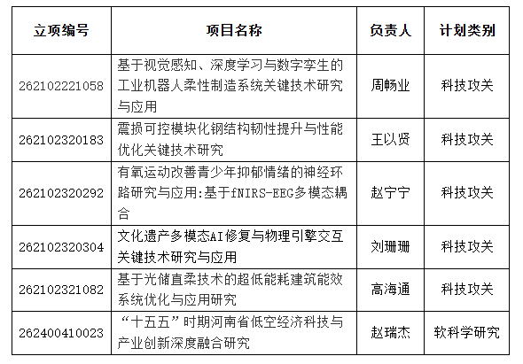 近日,河南省科学技术厅正式公布了《河南省二〇二六年科技发展计划》立项名单,我校再传捷报,共获批6个项目立项,其中科技攻关项目5项,软科学项目1项,彰显了学校在新型科技领域的研究实力与创新能力。