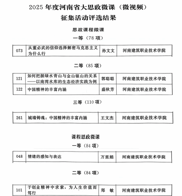 本次评选活动,在思政课程微课比赛中,教师孙文文的“从董必武的信仰选择解密马克思主义为什么行”荣获思政课程微课一等奖;教师郭聪聪的“如何把握绿水青山与金山银山的关系——以南湾水库的生态经济实践为例”荣获思政课程微课二等奖;教师盛秋芳的“中国精神的丰富内涵”荣获思政课程微课二等奖;教师王文杰的“城墙铸魂:中国精神的丰富内涵”荣获思政课程微课三等奖。在课程思政微课比赛中,教师万里娟的“情绪的感知与表达”荣获课程思政微课一等奖;教师郑敏的“于创业精神中求索,为人生价值而笃行”荣获课程思政微课二等奖。