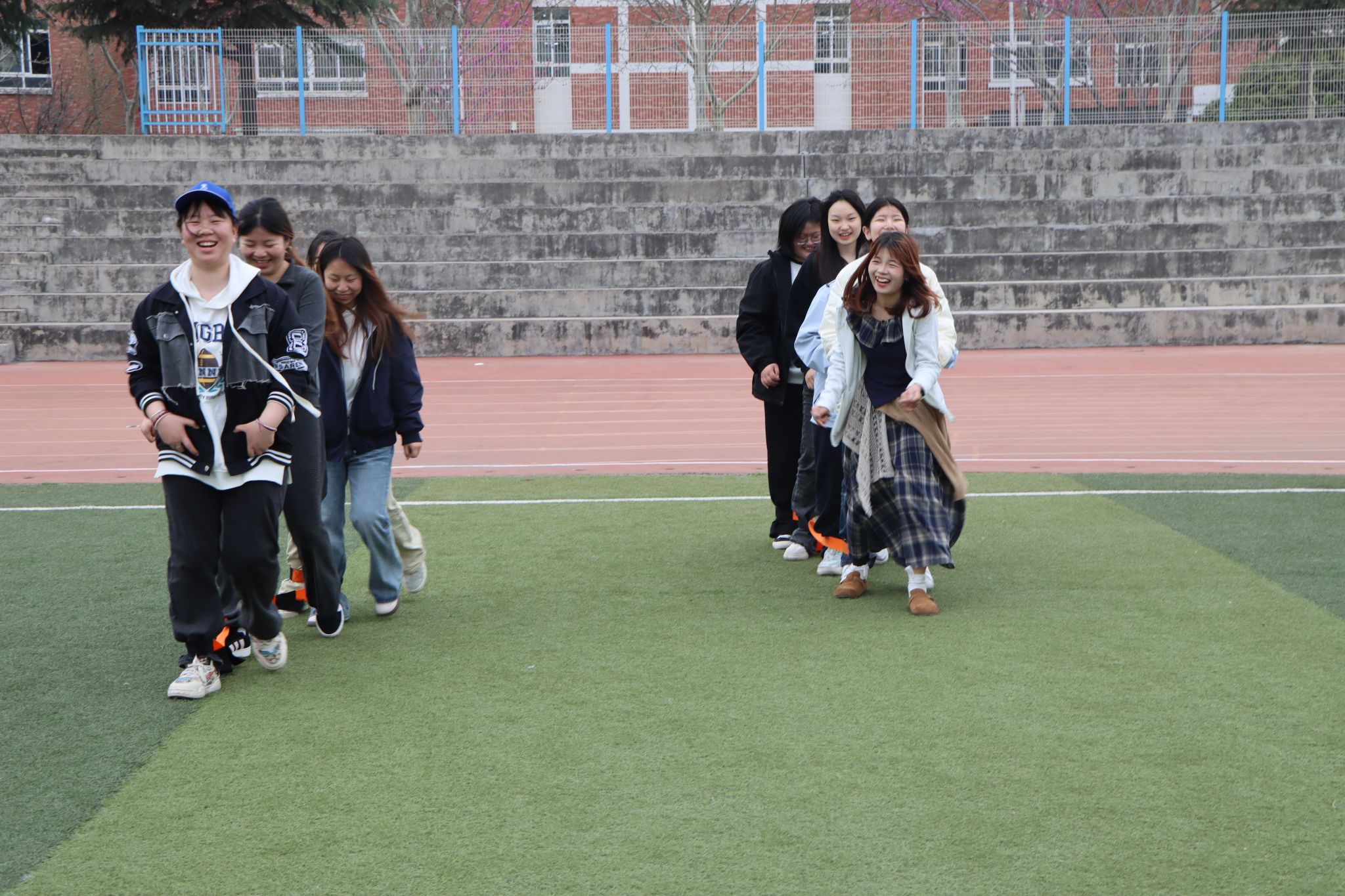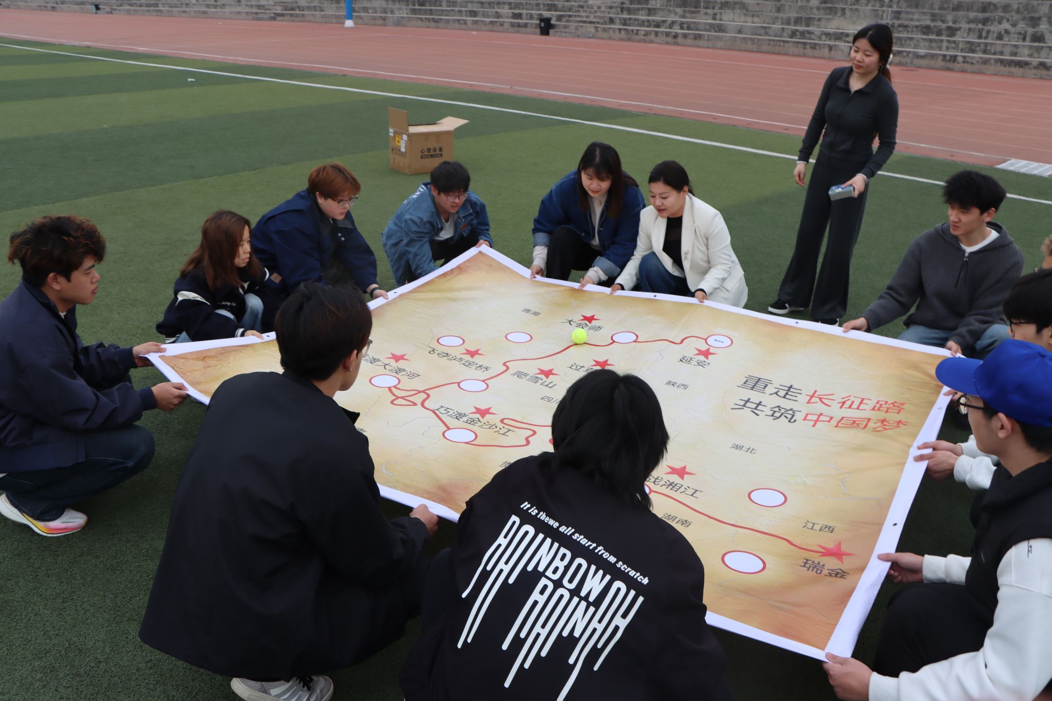 活动设计了三个红色主题拓展项目。“重走长征路”项目中,同学们通过模拟长征途中的艰难险阻,在协作行进中体会革命先辈的坚韧与团结;“飞雷破敌”轨道运球环节,队员们密切配合、精准传递,在紧张有序的节奏中感受智慧与默契的力量;“同心同行”多人绑腿跑项目则考验团队的协调与信任,同学们喊着口号、步伐一致,在并肩前行中凝聚集体向心力。活动现场气氛热烈,同学们全情投入,在挑战中突破自我,在协作中增进情谊。