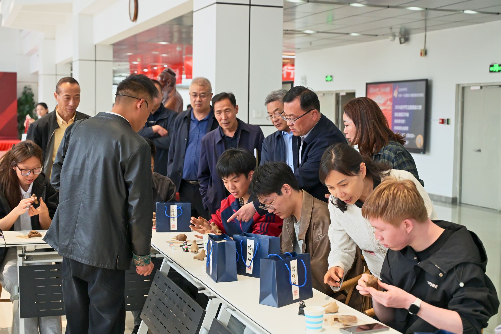 开幕式结束后,校领导一行参观了“回望与前行”美术作品展和新书闪借活动现场,详细了解展览内容与借阅流程。随后,校领导走进“泥咕咕”非遗体验区,与非遗传承人及正在体验的师生交流,鼓励大家亲身感受传统文化魅力,在动手实践中传承匠心精神。