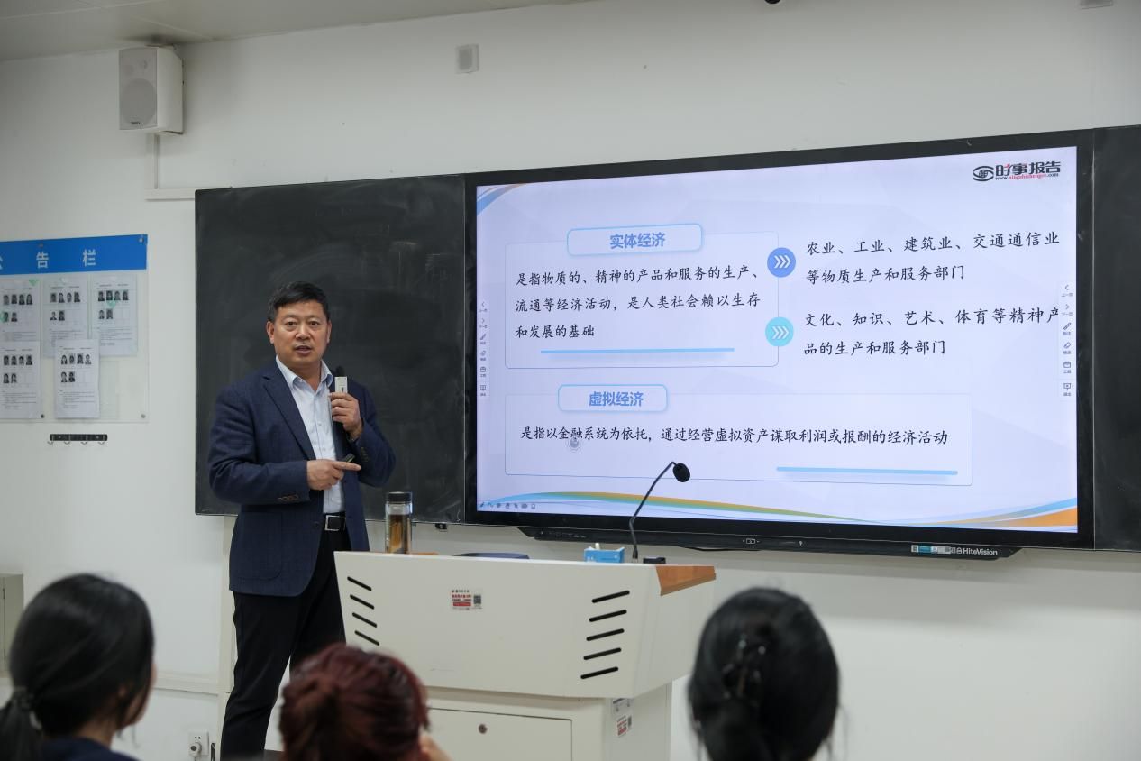校党委副书记刘振民以“强基固本 向实而兴——做实做强做优实体经济”为题,教育引导学生正确认识“十五五”时期,我国发展环境面临深刻复杂变化,发展战略机遇和风险挑战并存、不确定难预料因素增多。我们要坚持把发展经济的着力点放在实体经济上,我国经济是靠实体经济起家的,也要靠实体经济走向未来,压迫不断以创新绘就产业新篇,以实干筑牢强国根基,为基本实现社会主义现代化奠定更加坚实的基础。
