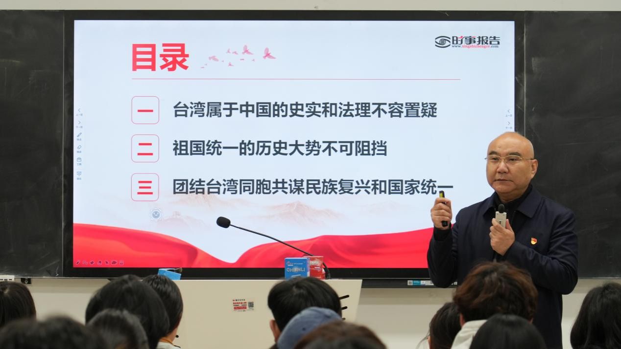 副校长王辉以“反‘独’促统 共创伟业——塑造祖国必然统一大势”为题,教育引导学生正确认识中华民族伟大复兴已经进入不可逆转的历史进程,展现出日益光明的前景。解决台湾问题、实现祖国完全统一是中国共产党矢志不渝的历史任务,是全体中华儿女的共同愿望,是实现中华民族伟大复兴的必然要求。两岸中国人、海内外中华儿女要共担民族大义、顺应历史大势,共同推动两岸关系和平发展、推进祖国统一大业。