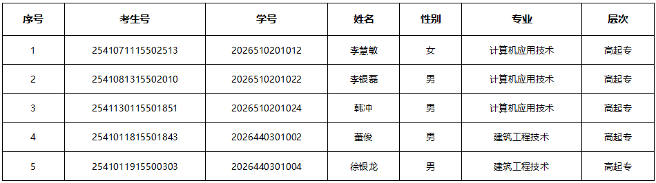 根据教育部《高等学校学生学籍学历电子注册办法》《河南省教育厅关于做好普通高等学校录取新生入学资格复查和学籍电子注册工作的通知》及《河南建筑职业技术学院高等学历继续教育学生学籍管理规定》等文件要求,经河南建筑职业技术学院继续教育学院研究决定,拟取消高等学历继续教育2026级李慧敏等5人的入学资格。