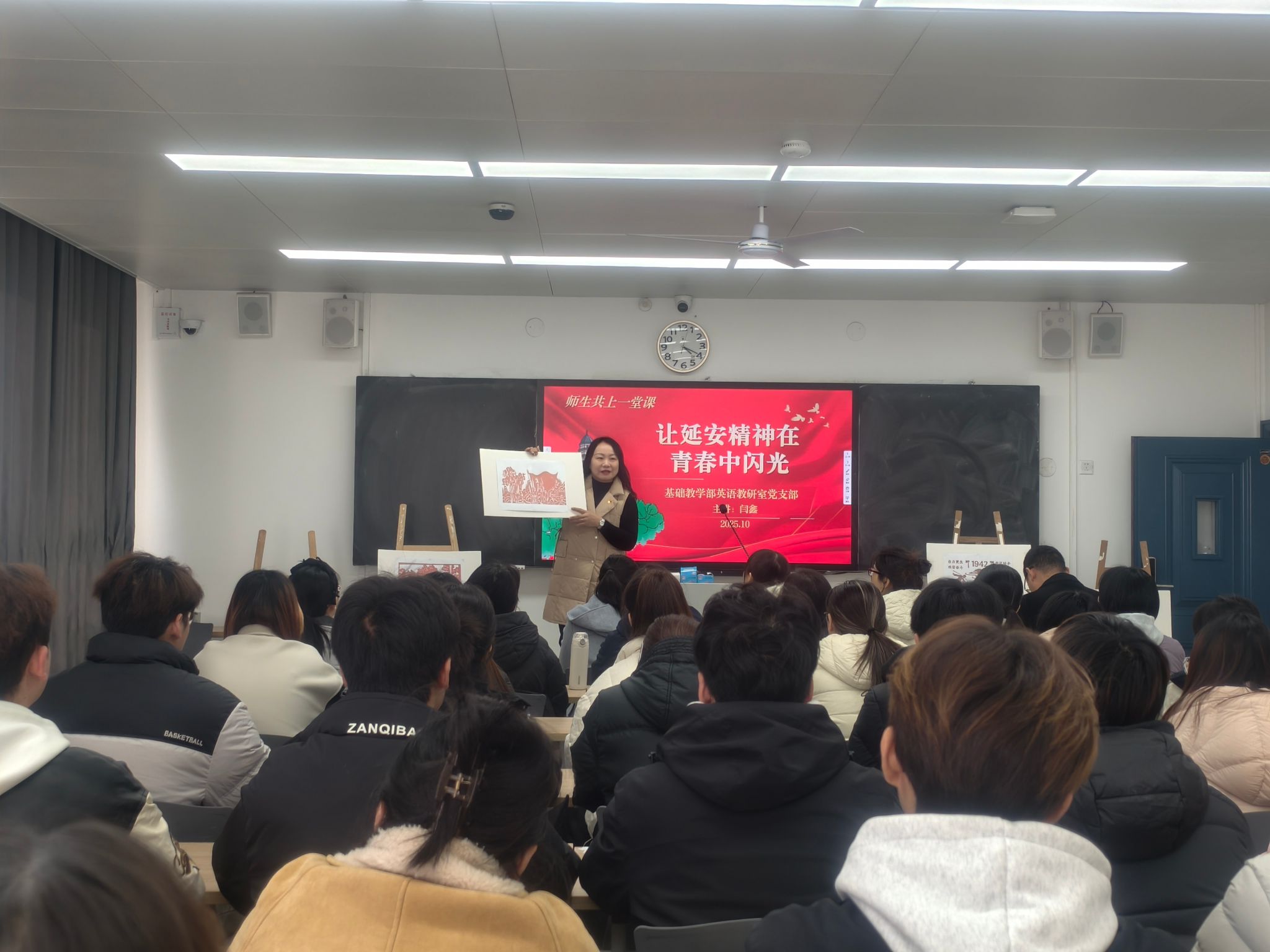 支部书记闫鑫为英语教研室党支部、建设信息工程系学生党支部教师及学生入党积极分子讲授《让延安精神在青春中闪光》主题党课。该党课突出沉浸式授课方式,通过图片、视频、展板等多种形式,从“精神之源”“青春之火”到“薪火相传”,帮助学生深刻理解延安精神“自力更生、艰苦奋斗”的核心内涵,筑牢思想之基。闫鑫书记以延安时期的青年为切入点,将张思德、南泥湾大生产、抗大、黄河大合唱等故事娓娓道来,为师生徐徐展开一幅热血青年在延安奋斗的历史画卷。通过师生共上一堂党课,让延安精神这一宝贵财富在青春接力中薪火相传、熠熠生辉。