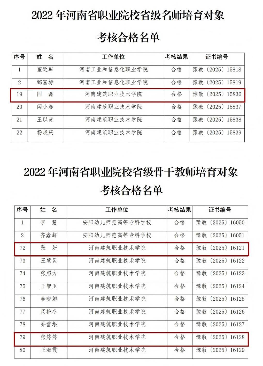根据《河南省教育厅 河南省人力资源和社会保障厅关于公布2022年河南省职业院校省级名师和省级骨干教师培育期满考核结果的通知》(教职成[2025]170号),我支部闫鑫荣获省级名师荣誉,张妍、张婷婷荣获省级骨干教师荣誉。在培训期内,“双带头人”党支部书记工作室以党建领航,多方位培养提升骨干教师的业务素质,为三位教师顺利完成考核奠定坚实的基础。