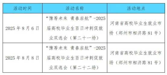 7月30日(本周三)、8月1日(本周五),河南省高校毕业生就业市场将举办“豫荐未来 青春启航”——2025届河南省高校毕业生百日冲刺促就业双选会第十九场和第二十场,欢迎2025届毕业生和往届未就业毕业生参加!