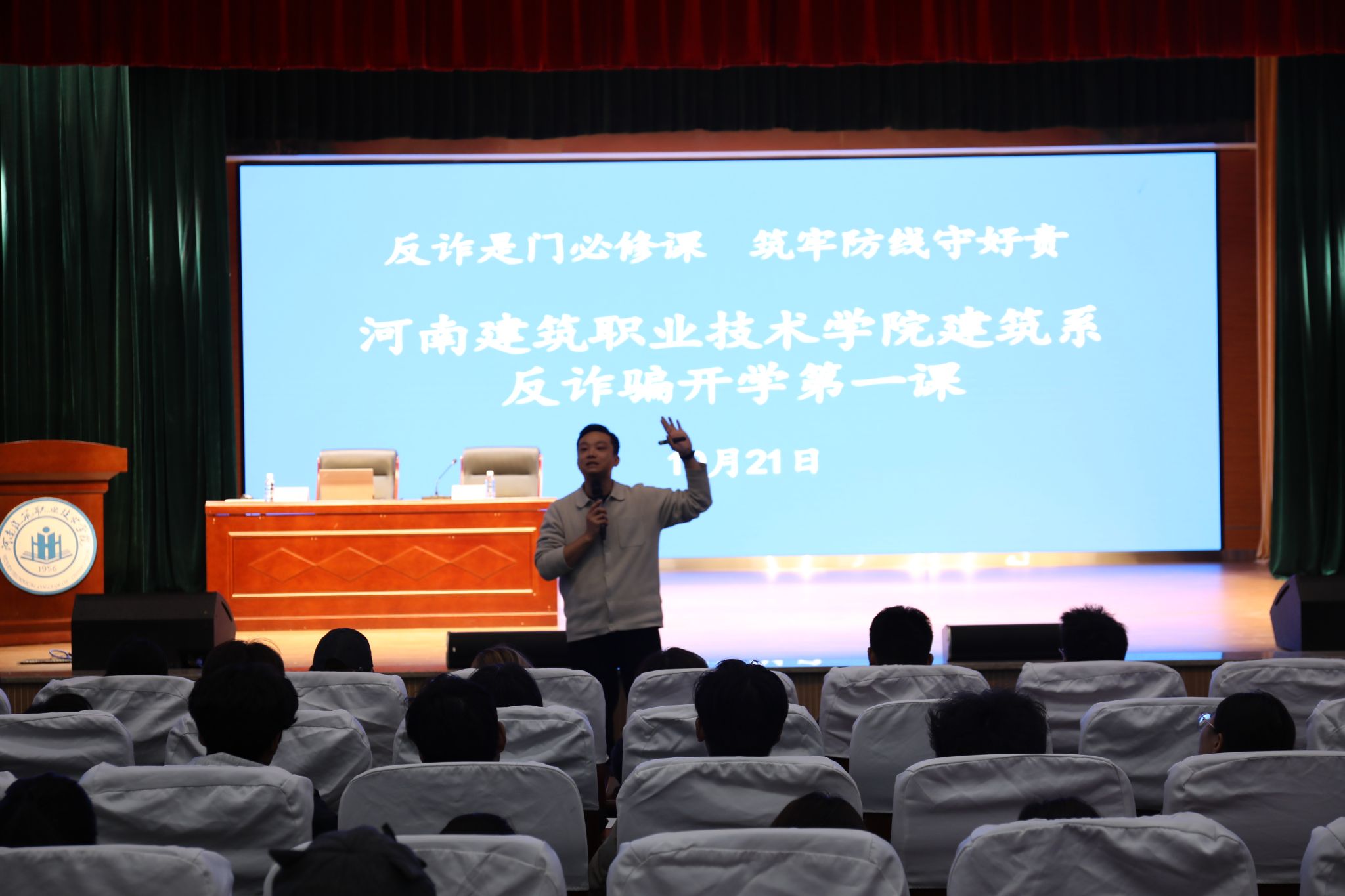 为持续做好校园反诈防骗安全教育,增强师生反诈安全意识,10月21日,建筑系在大礼堂举办“反诈是门必修课 筑牢防线守好责”安全专题讲座。特别邀请到河南省公安厅特聘反诈宣传专家、河南安巽科技有限公司反诈讲师苗雨露主讲,建筑系党总支书记张永辉,副书记甘泉,学工办主任漆喆,团总支书记于鑫,以及2025级辅导员和学生500余人聆听讲座。