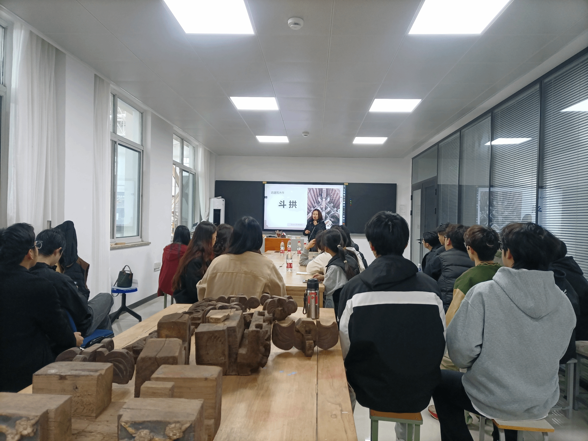 郑州天祥博物馆负责人任莹以天祥博物馆(任家古宅)为例,将斗拱的历史文化知识与结构特点融入其中,为师生们带来了一场精彩的木作斗拱讲座,也让大家对这座位于郑州高新区,始建于清朝中期的任家古宅的价值和魅力有了新的认识与了解。此外,他们还将博物馆内珍藏的清代文物“斗拱”带进课堂,让学生们近距离体验中国传统木作技艺的精妙与神奇。最后,博物馆专家们参加了学生实践周作业汇报活动,并对学生的作业给予了点评与指导。