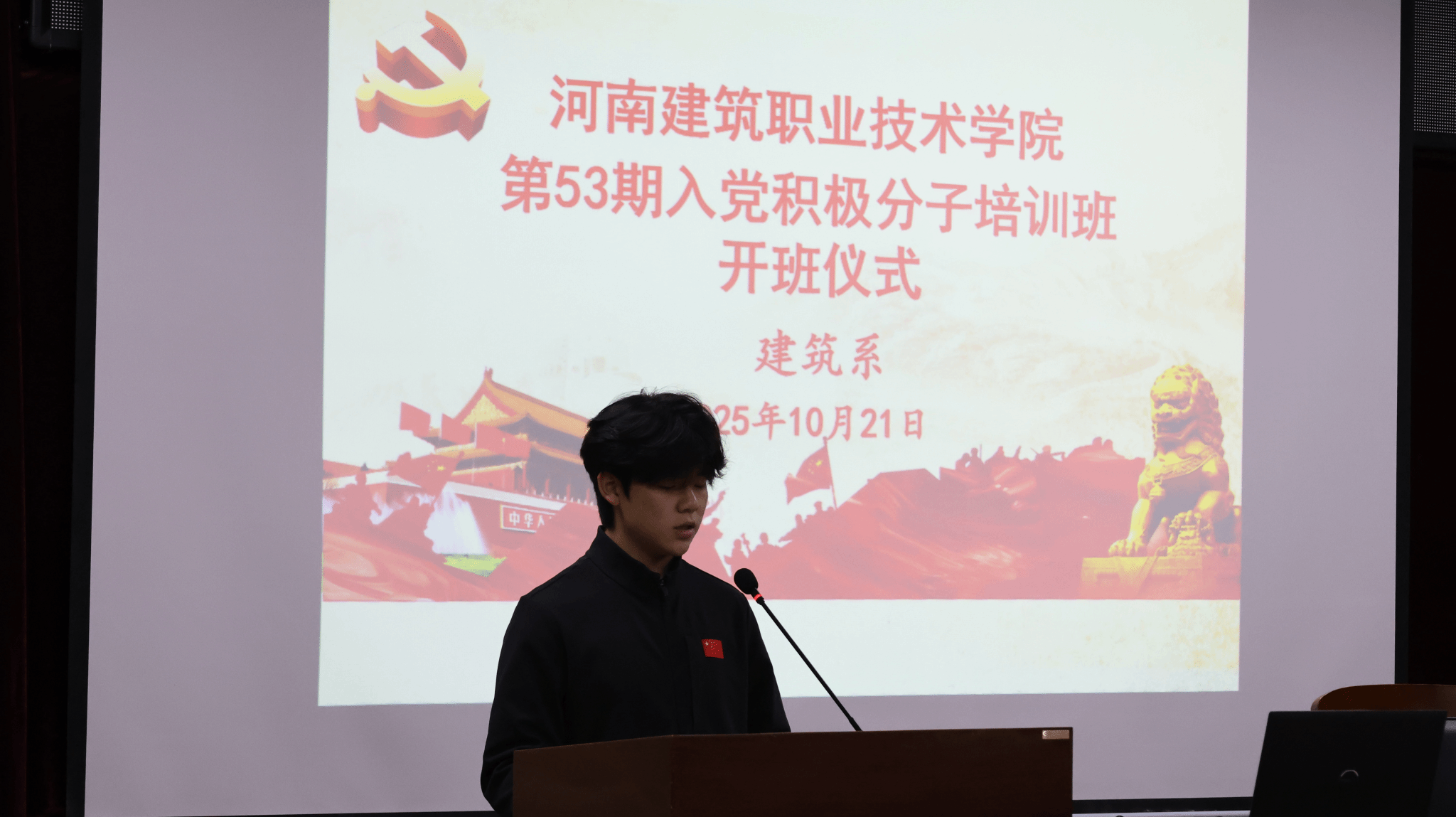 为深入学习贯彻习近平新时代中国特色社会主义思想和党的二十大和二十届三中全会精神,切实加强学校党的基层组织建设,提升党员发展质量。2025年10月21日,建筑系第53期业余党校开班式在C23报告厅隆重举行。河南建筑职业技术学院党委委员、副校长喻幕海出席开班式并做开班动员讲话,建筑系党总支书记张永辉、党总支副书记甘泉、建筑系副主任于胜男、团总支书记于鑫、党总支组织委员师慧、建筑系学生第二党支部书记仝潇参加了开班式。会议由建筑系党总支书记张永辉主持。