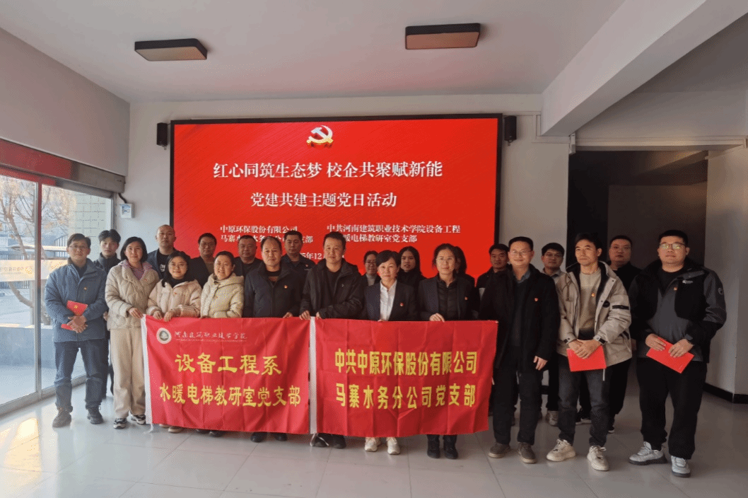 为探索新时代基层党建工作新思路、新模式,深化校企合作,促进党建与业务工作深度融合,2025年12月16日,设备工程系水暖电梯教研室党支部与中原环保股份有限公司马寨水务分公司党支部联合开展了“红色同筑生态梦 校企共聚赋新能”主题党日活动。活动旨在通过共建共享,实现优势互补,共同提升党组织的创造力、凝聚力和战斗力。设备工程系党总支书记常洋和水暖电梯教研室党支部所有党员参加。