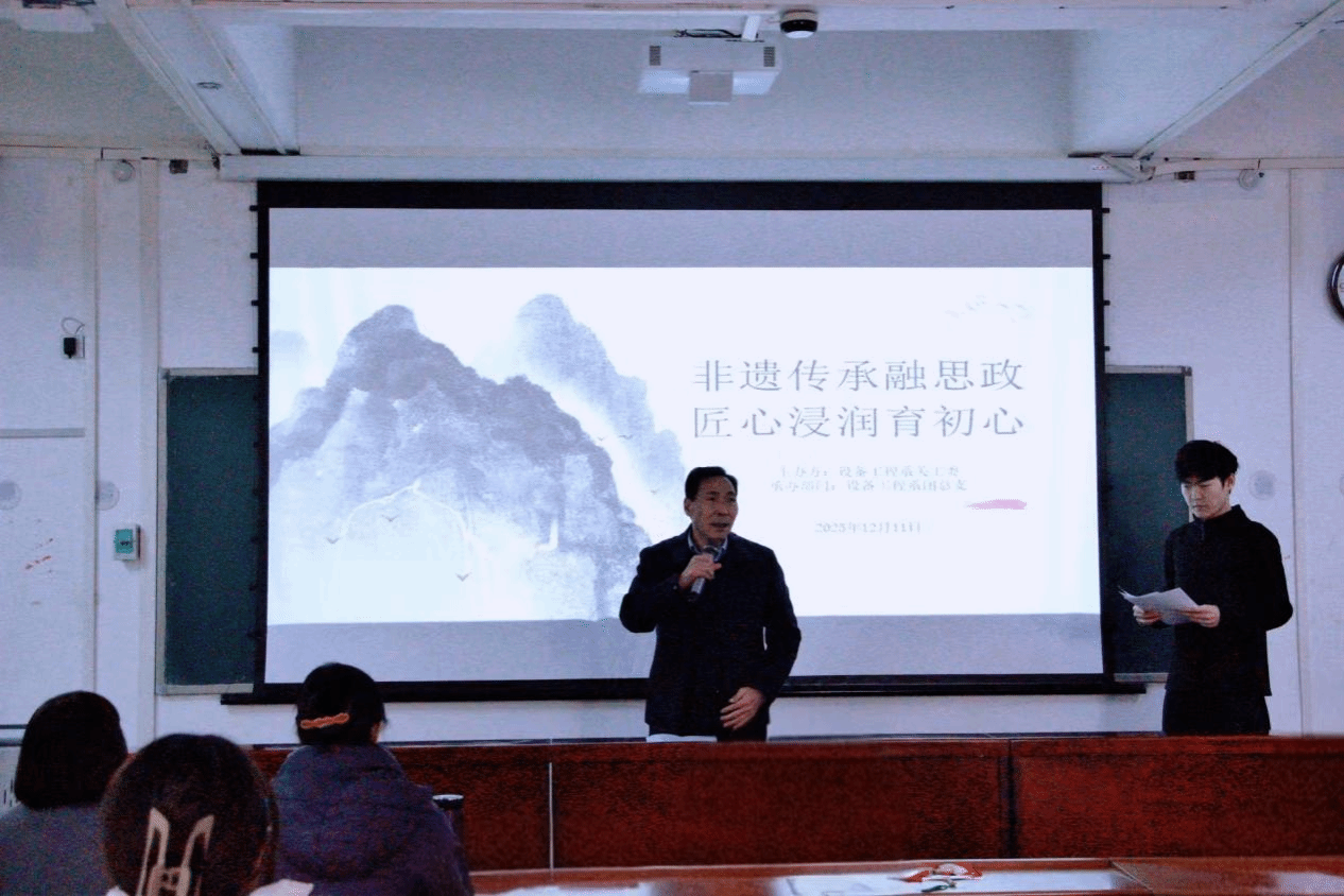 校纪委书记袁长林为活动致辞,他指出,非遗传承与思政教育的结合是培养时代新人的重要路径,中华优秀传统文化是思政教育的深厚沃土,非遗中蕴含的工匠精神、家国情怀与社会主义核心价值观高度契合。他寄语同学们,既要学好非遗技艺、增强文化自信,更要领悟匠心内核,将个人成长与国家发展、文化传承紧密联结。退休老教师朱缨作为“五老”代表分享感悟,她结合数十年教育与行业经历,强调非遗技艺背后“择一事、终一生”的坚守,指出这份匠心与设备工程领域追求的精准严谨一脉相承,鼓励同学们争做传统文化传承者与有担当的新时代青年。