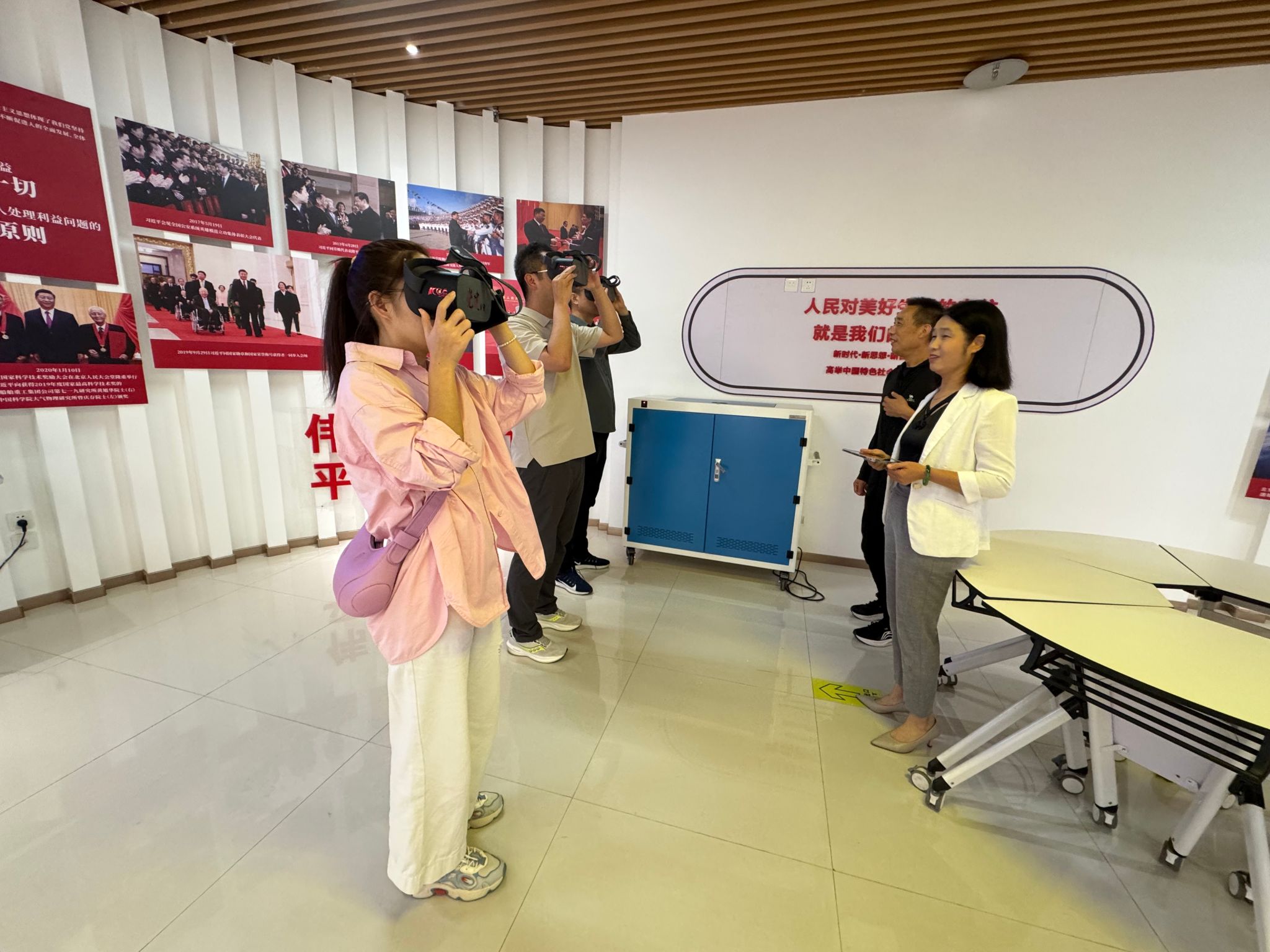 在“三全育人”实践教学基地,王永仁院长带领大家参观了理论成果展示区、3D观影体验区、VR交互体验区。在理论成果展示区,王永仁院长系统介绍了学院“三全育人”体系的建设成果,通过图文展板、案例视频及互动装置,展示了“思政课程+实践育人+文化浸润”三位一体的育人模式。在3D观影体验区,河南地矿职业学院参观团队戴上3D眼镜,沉浸式观看了思政教育影片,感受技术赋能思政课堂教学的魅力。在VR交互体验区,参观团队佩戴智能设备,沉浸式体验了“重走长征路”项目,通过虚拟仿真技术,不仅可以“走进”遵义会议现场,还可以亲身体验“攀登”雪山、“跋涉”草地等长征场景。