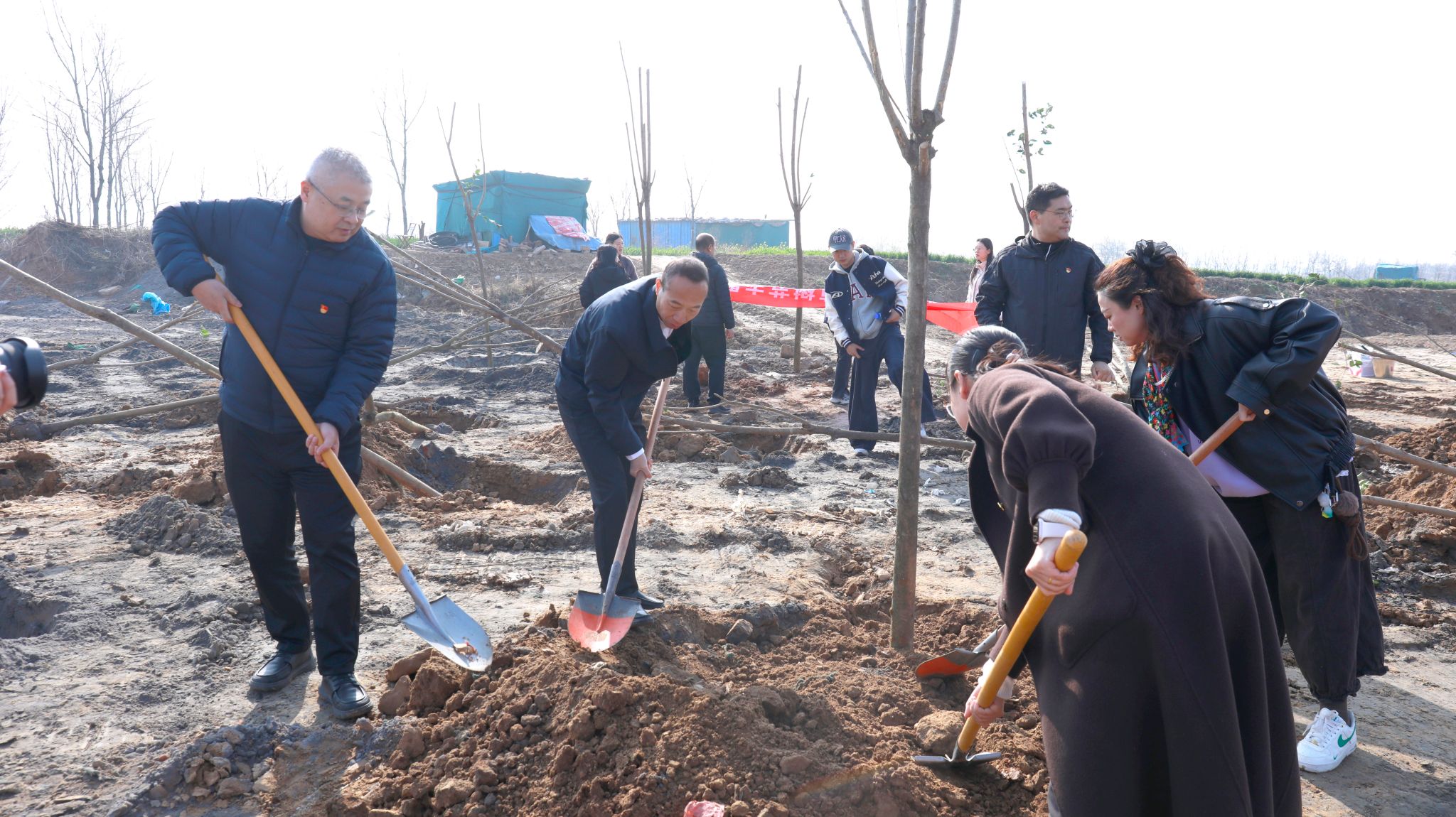活动伊始,崔东方作动员讲话。他以“十年树木,百年树人”为喻,勉励师生像树苗般扎根成长,既脚踏实地筑牢根基,又志存高远追逐理想,真挚寄语为大家注入奋进力量。随后,植树劳动正式展开。师生们迅速分工、默契协作,挥锹铲土、扶苗定株、培土压实,现场一派热火朝天。经过近一小时奋战,数十棵新苗迎风挺立,为乡村增添了盎然生机。植树结束后,师生们在心愿卡上写下“绿色常在,初心不改”等期许,轻轻系于树梢,让希望与新绿共生长。最后,全体师生在植树现场合影留念,定格下这一意义非凡的时刻。