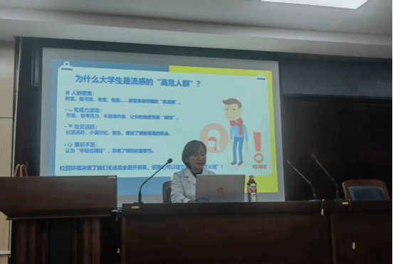 针对校园生活中的感染风险,主讲人提出了具体可行的防护建议:宿舍应每日开窗通风,累计不少于2小时;避免共用牙刷、剃须刀等个人物品;在人员密集场所规范佩戴口罩;鼓励及时接种流感、HPV等相关疫苗;出现发热、咳嗽等异常症状,须第一时间向辅导员报告并及时就医,以防疾病传播。