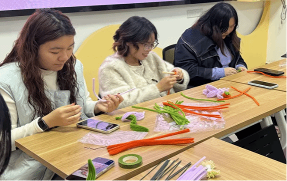 在创作环节,同学们充分发挥想象力,在掌握基本技巧的基础上融入个人创意,将对生活的热爱与对未来的憧憬凝聚于指尖。有的巧妙改造矿泉水瓶和小纸箱,制作出独具特色的花瓶;有的精心搭配色彩,创作出温馨雅致的百合与寓意吉祥的“柿柿如意”花束,表达对亲友的诚挚祝福。经过近两小时的精心制作,一朵朵形态各异、栩栩如生的手工花在同学们手中绽放,每一件作品都凝聚着创意与心意。