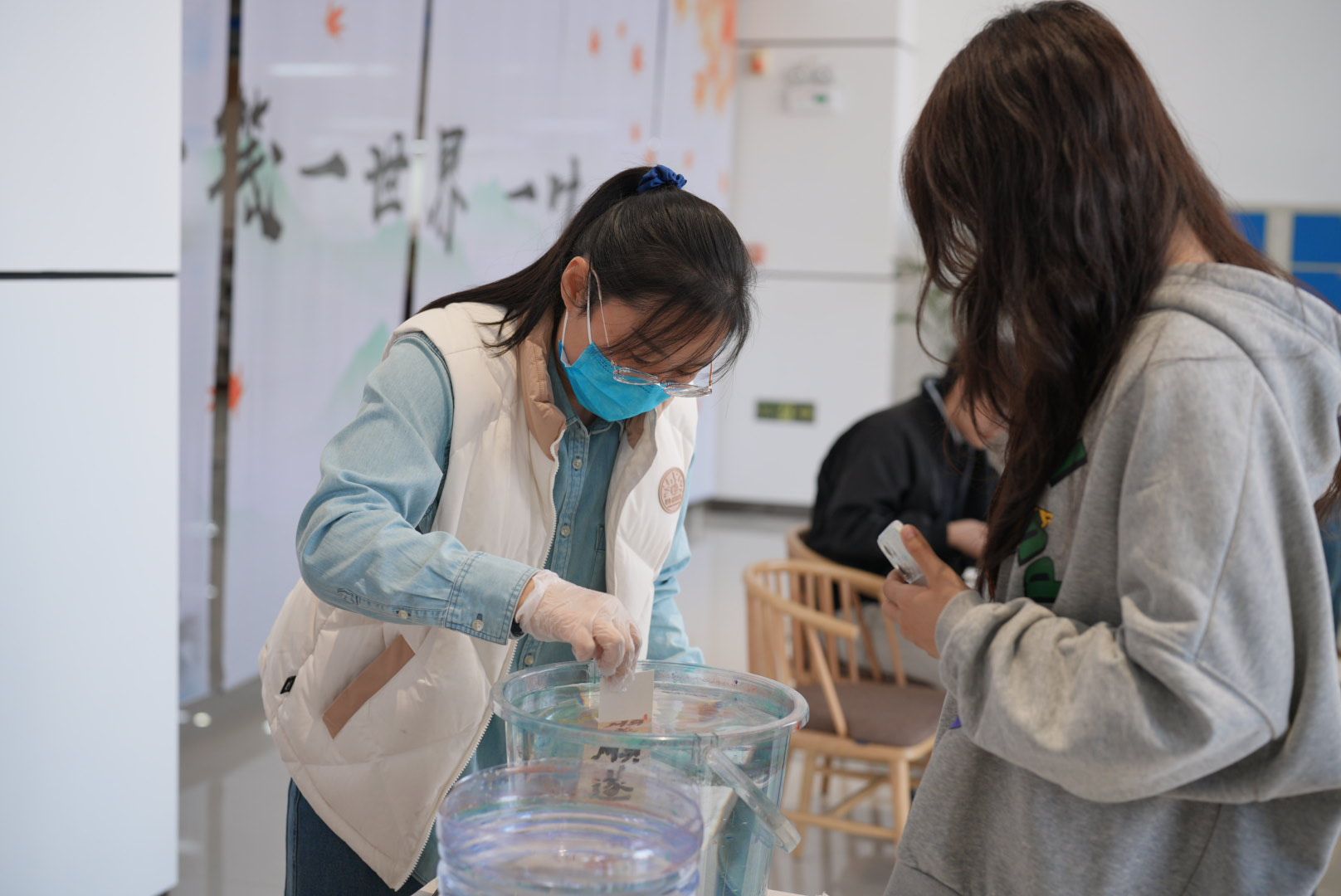 活动现场墨香悠远,色彩斑斓,三大体验区人头攒动,气氛热烈而温馨。在“笔走龙蛇”书法区,书画协会的同学们执笔、运腕,一方方宣纸书签承载着青春的梦想与期许,墨迹间流淌的是真挚的个人情感与独特的个性表达。“浮光掠影”漂漆区则充满了独特的艺术魅力。在读书协会成员的演示下,同学们惊叹于色彩在水面自然交融、勾勒出如星河、如山峦的奇幻纹样。当书签浸入水中,将这份独一无二的偶然之美拓印留存时,每一枚成品都引来了阵阵赞叹。在“秋色入笺”干花体验区,汉颂社的同袍们与参与者一同筛选、构思,将片片风干的秋叶与花瓣精心排列,用巧手将转瞬的秋光封存于书签之中。现场欢声笑语不断,大家互相欣赏彼此的作品,在动手实践中感受到了传统技艺的魅力与协作分享的快乐。