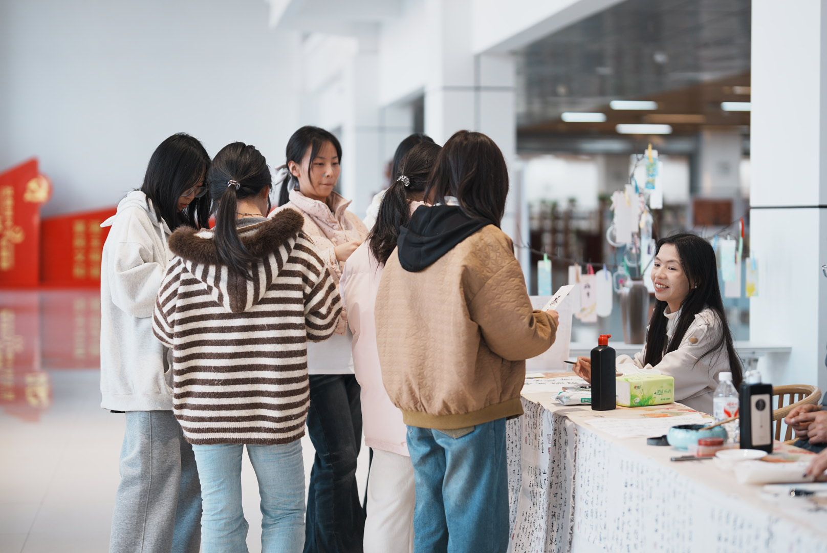 11月13日,由图书馆主办,筑墨书画协会、书墨香读书协会、汉颂社、追影摄影协会联合协办的“墨染秋笺,漆韵留香”深秋书签制作雅集在图书馆二楼大厅温情落幕。本次活动旨在通过传统手作体验,弘扬中华美育精神,丰富校园文化生活,吸引了众多师生踊跃参与。