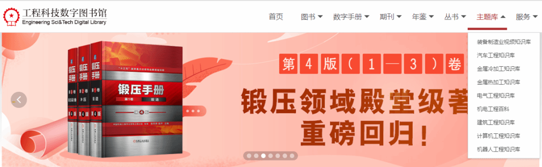 《工程科技数字图书馆》是由机械工业出版社开发和运营的电子出版物发布平台,平台以工程科技为特色汇集众多优质独家内容,资源类型包括电子书、电子期刊、工业视频、机电百科等,支持PC和移动跨终端使用。含“装备制造业视频库、金属热加工知识库、汽车工程知识库、金属冷加工知识库、电气工程知识库 、计算机工程知识库、建筑工程知识库、机电工程百科、机器人工程知识库”9大子库。工程科技数字图书馆通过数字技术实现专业出版内容的高效精准传播、聚类和检索,以更好的服务专业读者、辅助教学科研、助力产业升级。