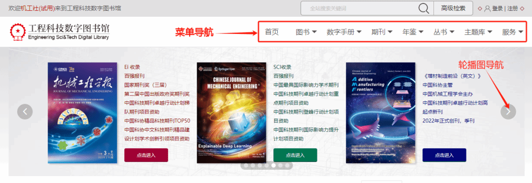 在轮播图中设置了《机械工程学报》 和《电气工程学报》 的导航。作为核心期刊两刊在业界一直享有盛誉。通过该导航,用户不但可以阅读到最新的专业文章,还可以免费进行全文下载。