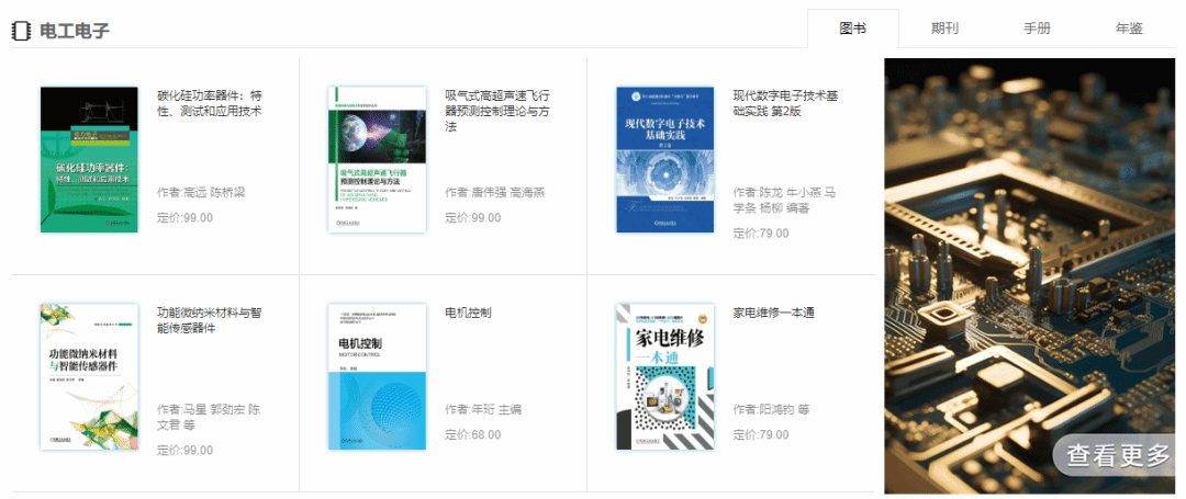 作为检索和分类的补充,平台还在首页设置了“机械”“电工电子”“建筑”“计算机”和“汽车”5 个专业展示区。以“电工电子”为例(如下图所示),相关专业用户可以快速定位该区并获取到感兴趣的内容(图书、期刊、手册、年鉴等)。