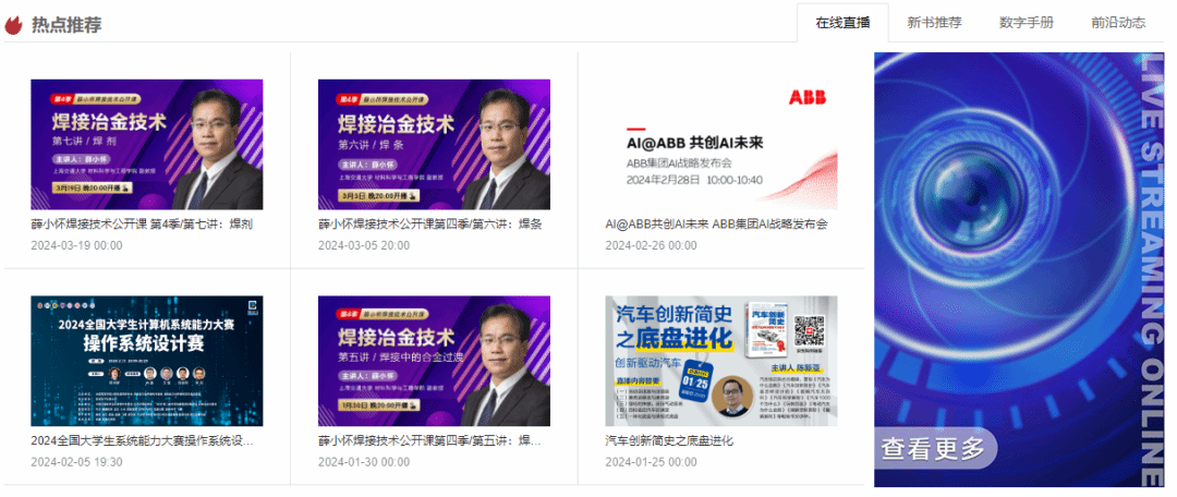 热点推荐栏目是本平台的特色栏目,如下图所示。该栏目共设有“前沿动态”“新书推荐”“数字手册”和“在线直播”4 个子栏目。通过该栏目用户可以了解到最新的前沿动态、最新的图书信息、最新的数字产品以及最新的直播内容(大咖云集)。