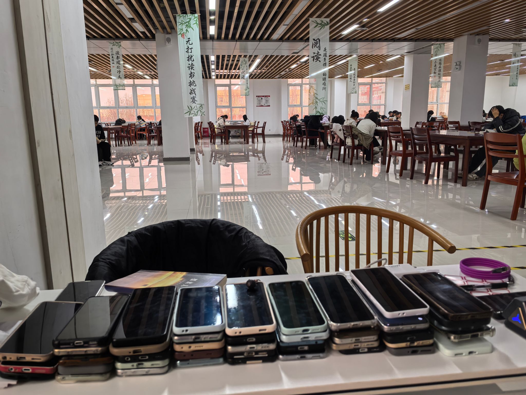 12月18日16时至18时,图书馆联合书墨香读书协会组织开展了“无打扰读书挑战赛”活动。活动要求参与者在两小时内将手机统一存放,进行专注阅读。