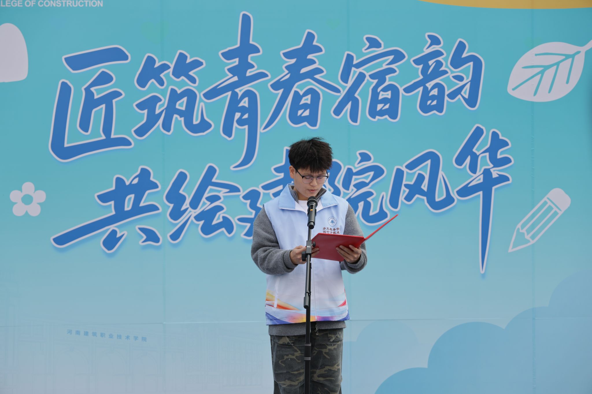 建筑系2025级李雨航同学作为参赛代表,以“承匠心底色・赴宿居之约”为题发言。他结合自身对“一站式”学生社区的亲身体验与深刻感悟,代表全体同学作出郑重承诺:将以饱满热情全情投入活动,以严谨态度守护宿舍日常安全,以专业所长彰显建院学子的责任担当,用实际行动为社区文化建设添砖加瓦。