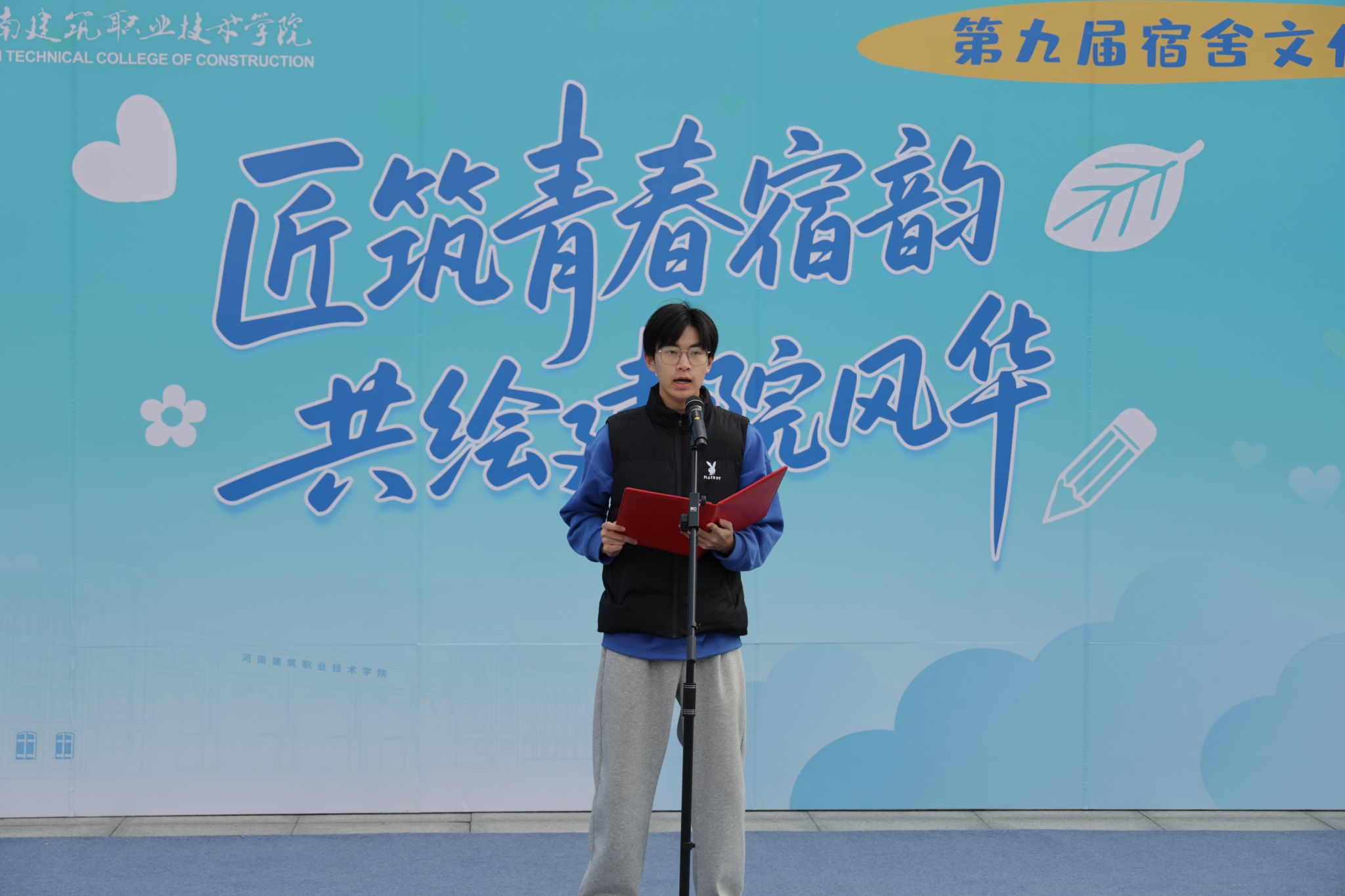“建梦翼航”服务队代表张京博同学作表态发言,服务队将始终以“安全为盾、以公平为尺、以服务为桥”,通过全程在岗值守、实时监督反馈、应急快速响应等务实举措,全力协助学校全力为同学们营造安心参赛、舒心体验的良好氛围,为宿舍文化节的有序开展筑牢坚实保障防线。