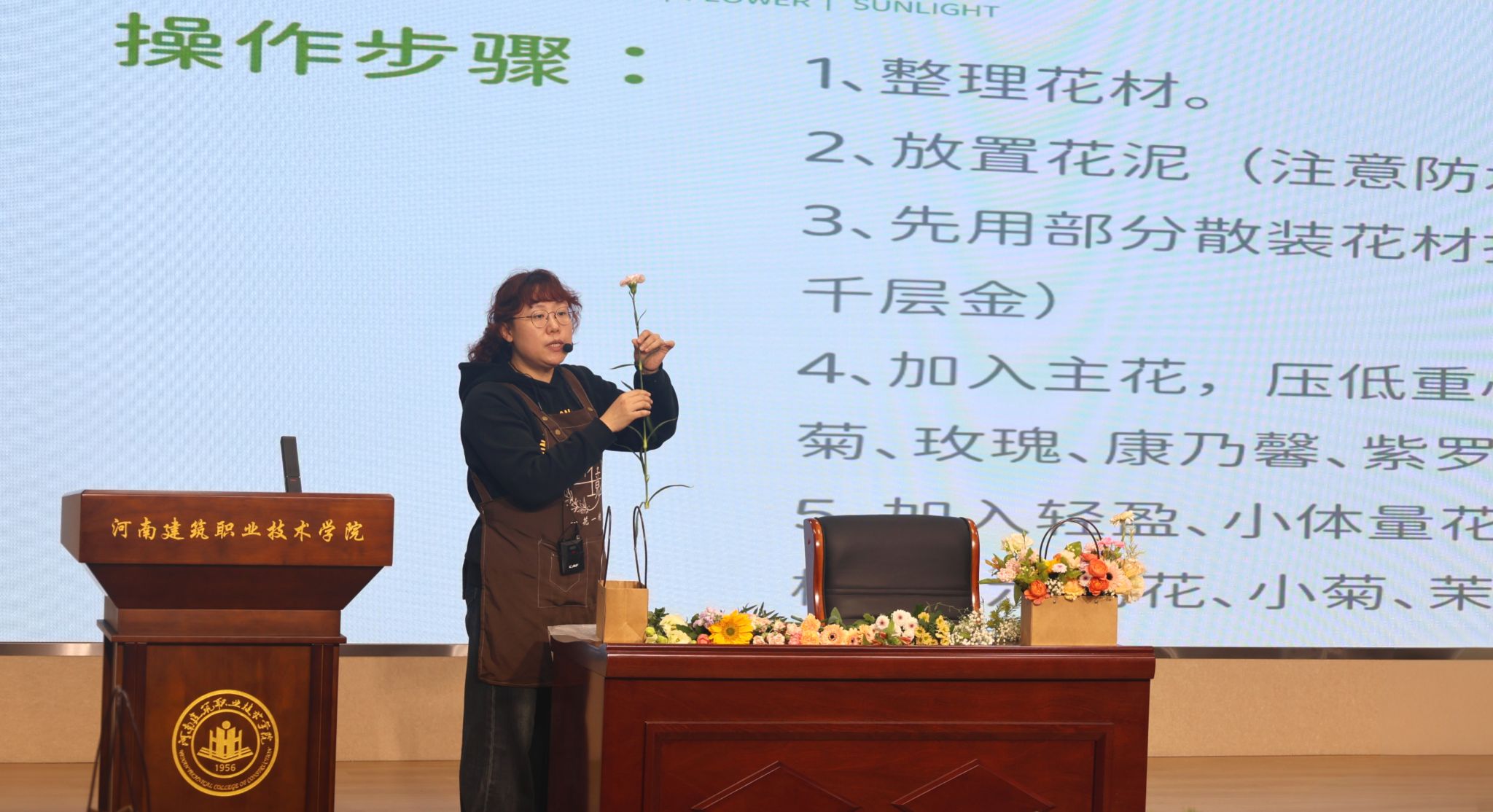 在学生工作部(处)、建筑系协同组织下,活动现场布置温馨雅致,师生参与热情高涨。程璐璐老师以“花艺疗愈的内在力量”为切入点,结合自身教学实践经验,从花材修剪技法、主次花材搭配逻辑,到色彩协调原则、空间层次感营造等维度,进行细致讲解与现场演示。师生们全情投入花艺创作,在专注中感受它们的美好,在与花草的对话中舒缓身心。