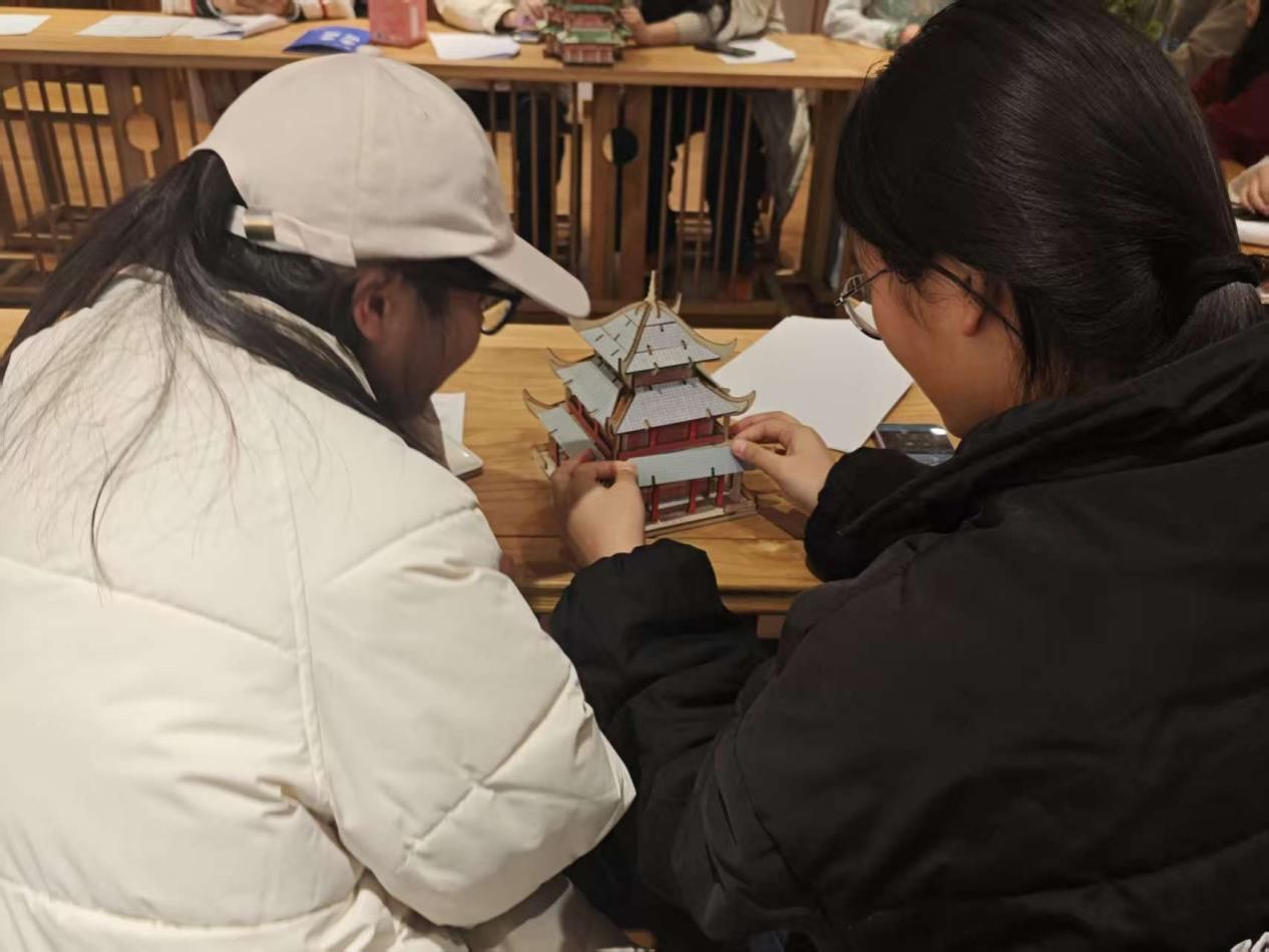 活动开始,社团成员分组协作,还原榫卯结构,动手拼搭古建筑模型,从祈年殿的巍峨庄严到苏州园林的曲径通幽;从黄鹤楼的“白云千载空悠悠”,到爱晚亭的飞檐翘角,每一块模型的拼接都是对建筑智慧的致敬,在动手过程中直观感受传统建筑的匠心巧思。