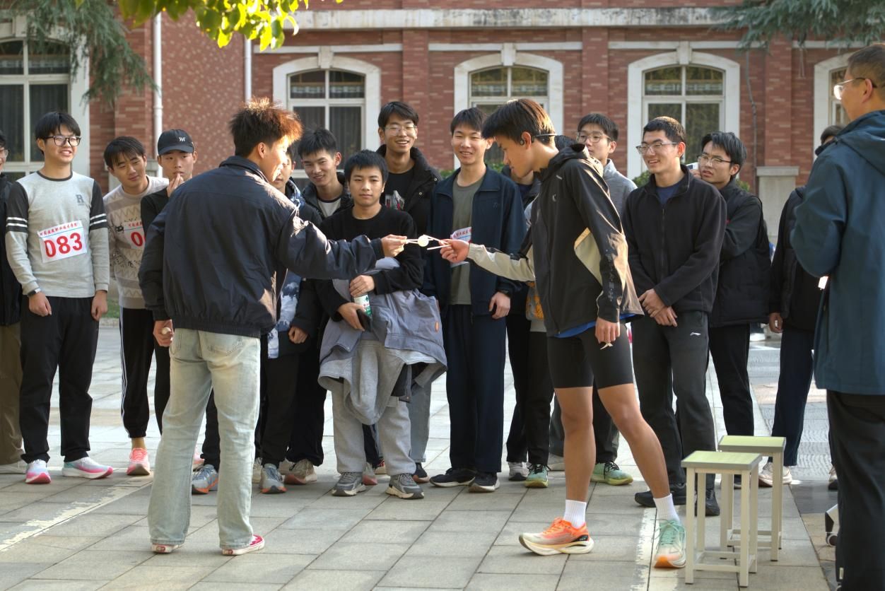 活动筹备阶段,工作组通过线上多平台宣传、线下海报与流动宣讲相结合的方式全方位营造氛围,同时招募培训15名志愿者,明确岗位职责与应急流程,并开通线上线下双报名渠道,方便师生跨院系组建3人队伍参赛,为活动顺利开展筑牢基础。比赛于当日下午3点30分在人工湖广场鸣枪起跑,参赛队伍沿五公里赛道奋勇争先,途经实验楼、大礼堂等校园地标,赛道中设置的“星火相承”“矢志不移”“青春筑路”三个红色主题打卡点极具特色,队员需完成筷子传乒乓、投箭壶、搭建临时“道路”等趣味挑战,既考验协作又传递红色精神。每400米处的志愿者全程提供引导与补给,电子计时与人工记录双重保障成绩准确。下午4点30分左右,所有队伍陆续抵达下沉式操场终点,活动为获奖队伍颁发运动装备等奖品,完成全部打卡的队伍还收获了定制文创“神秘大奖”。